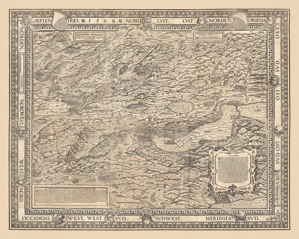 L'"Eigentliche Verzeichnuss der Stätten, Graffschafften vnd Herrschafften, welche in der Statt Zürich Gebiet vnd Landscafft gehörig seind", créé par le célèbre cartographe Jodocus Murer en 1566, est une fenêtre captivante sur le passé. Cette magnifique carte picturale vue à vol d'oiseau délimite méticuleusement le canton de Zurich, offrant un chef-d'œuvre monochrome qui est autant un triomphe artistique qu'un document historique. L'œuvre de Murer, encadrée par une bordure décorative représentant des têtes de vent et des crânes détaillés, respire l'esprit de la Renaissance, combinant un art complexe avec une représentation géographique précise.