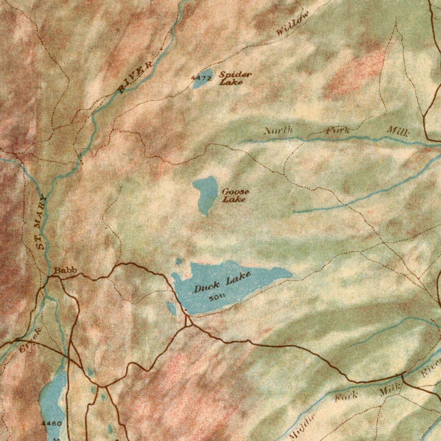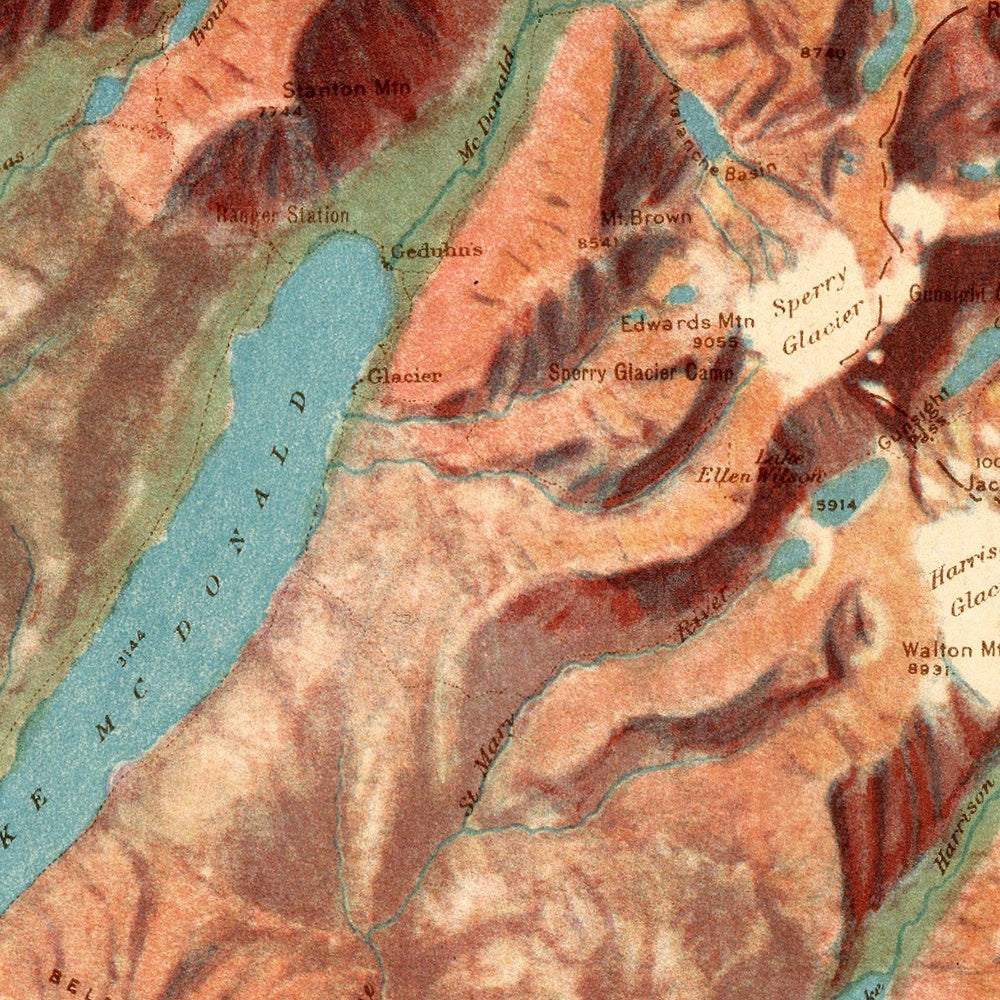 Old Relief Map of Glacier National Park, Montana, 1914: Logan Pass, St. Mary L., L. McDonald, Many Glacier, Chief Mt