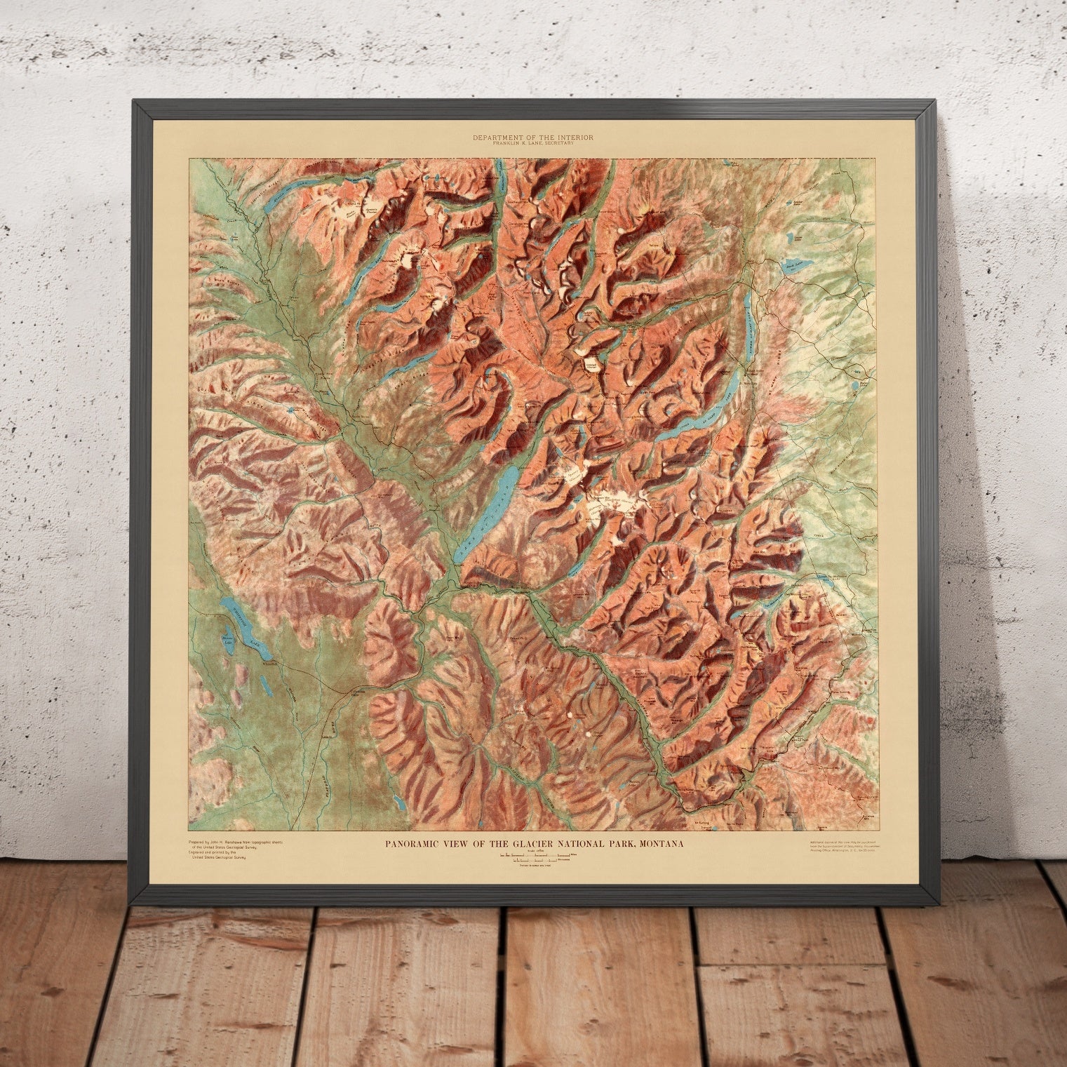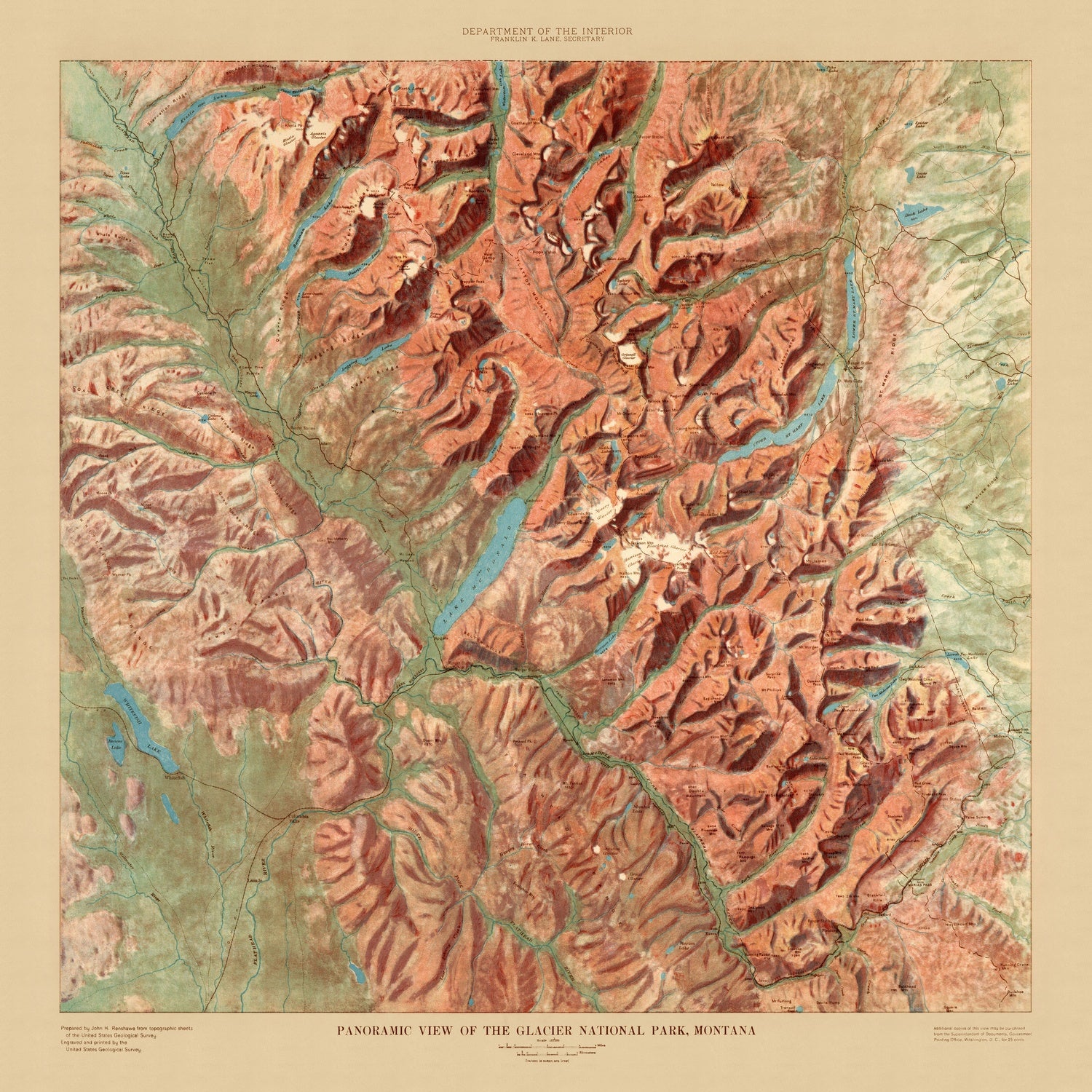 Issued in 1914 by the U.S. Geological Survey, this Panoramic View of the Glacier National Park captures the “Crown of the Continent” at a formative moment in American conservation history. Executed in rich, full-color shaded relief, the artwork dispenses with contour lines in favor of painterly modeling that renders the park’s mountains, valleys, and waterways with striking three-dimensional immediacy. Light and shadow sweep across serrated ridgelines, while the luminous blues of glacial lakes anchor the scene. Created just four years after the park’s designation, the view reflects an early 20th-century movement to reveal—and thereby preserve—the grandeur of the nation’s wild places, pairing scientific observation with an evocative aesthetic intended to stir public imagination.