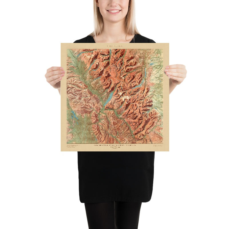 Cartographically, the piece is a masterclass in shaded relief—subtle tonal gradations stand in for numerically dense contours, allowing landforms to “rise” from the sheet with sculptural credibility. The palette articulates elevation and aspect with naturalistic restraint: cool shadows in north-facing cirques; warm sunlit slopes on southern exposures; deep, glassy blues for the major lakes. Peaks and passes are crisply lettered, guiding the eye through the orographic logic of the park, while rivers braid through valley bottoms to stitch the composition together. A refined cartouche seals the work with title and provenance, underscoring its official stature and early 20th-century design ethos.