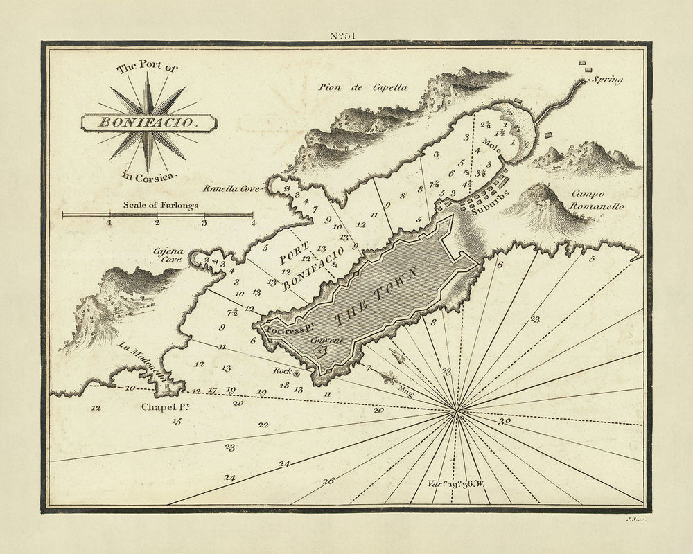 Vieux Port de Bonifacio, Corse Carte Nautique par Heather, 1802: Ville, Profondeurs, Forteresse, Anse Ranella