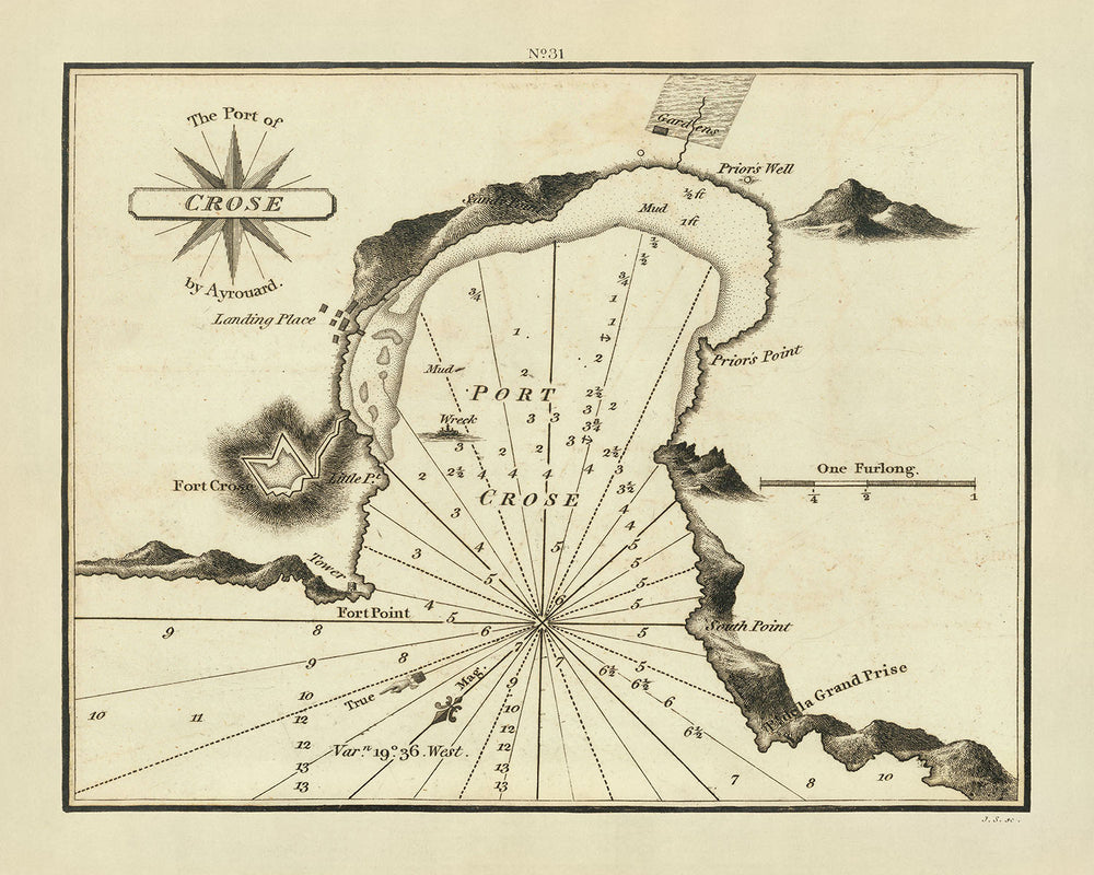 Détails de navigation et caractéristiques de la carte "Le Port de Crose" est un témoignage des défis de navigation de l'époque et de la précision cartographique de Heather. Employant la projection de Mercator, connue pour sa capacité à préserver la fidélité des angles, la carte est un outil indispensable pour les études de navigation historique. Elle détaille minutieusement la côte, les sondages de profondeur et les dangers maritimes, y compris le site de naufrage notoire marqué comme 'Naufrage' sur la carte. Des points de repère notables tels que Fort Cros, le Puits du Prieur et la zone sinistrement nommée Boue sont clairement indiqués, offrant une vue d'ensemble des structures défensives et des ressources du port.