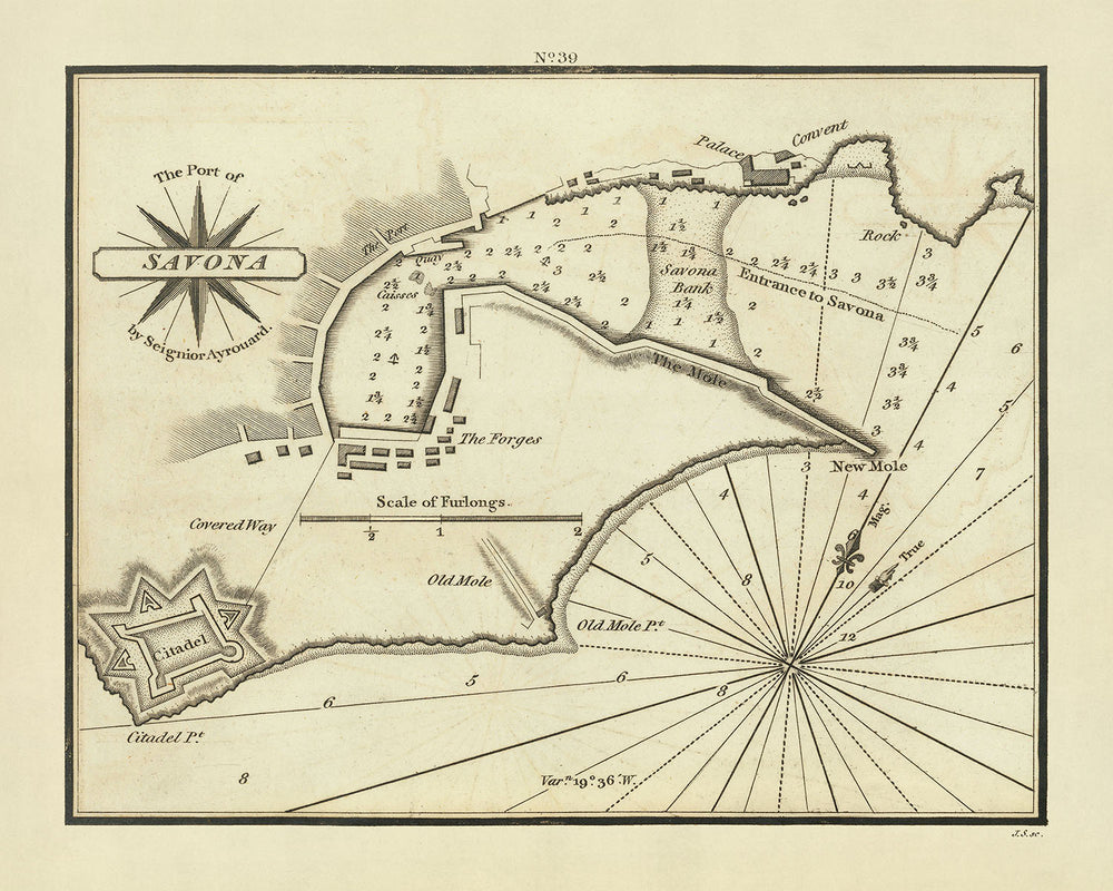 Carte nautique du Vieux-Port de Savone par Heather, 1802 : port, citadelle, couvent
