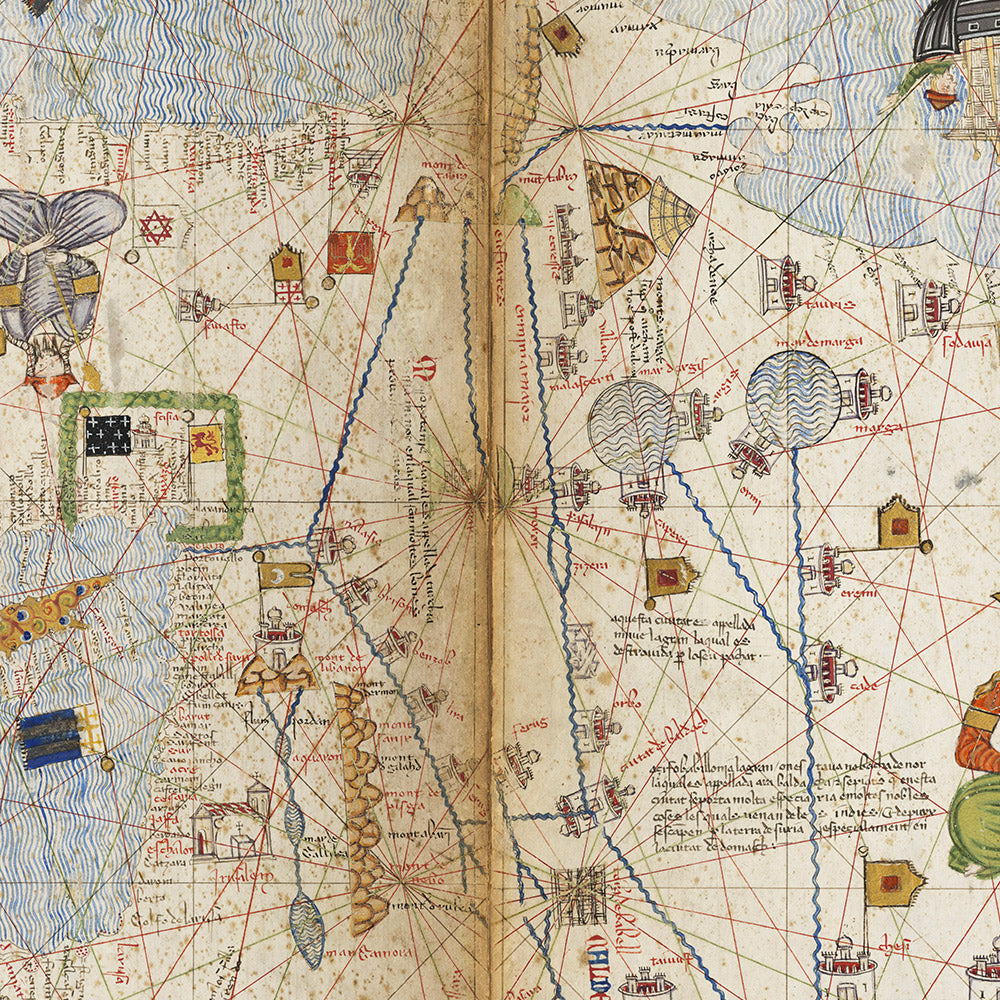 The Catalan Atlas, crafted circa 1375 by Cresques Abraham of the Majorcan cartographic school, stands as the zenith of medieval map-work and the most important medieval map in the Catalan language. A Jewish book illuminator famed for mappae mundi and compasses, Cresques fused erudition with dazzling imagery. The seas undulate in vertical bands of wavy blue, while cities bristle with colored flags proclaiming allegiance. Religious symbology distinguishes Christian centers crowned with crosses from others capped by domes, all gravitating around the Atlas’s spiritual anchor: Jerusalem at the center. Designed to be read flat, with inscriptions oriented toward the margins, this grand synthesis marries art and knowledge. Its distinctive compass rose marks the first known use on a portolan chart.