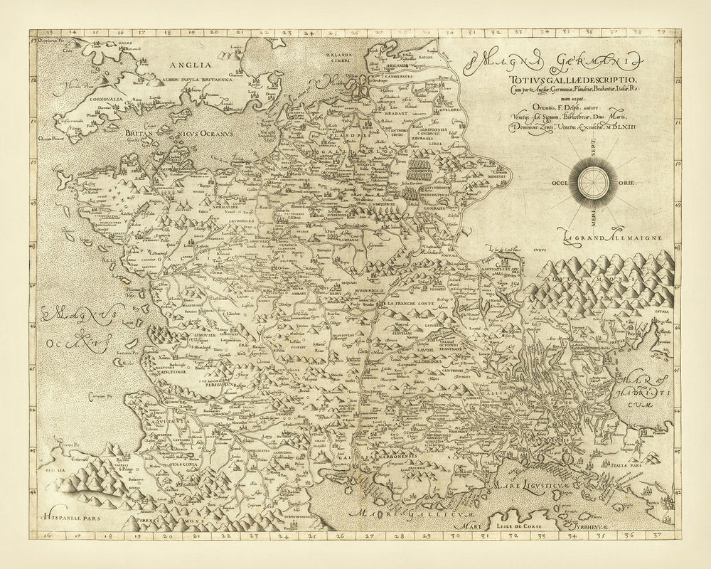 L'étendue géographique de la carte est vaste, englobant l'intégralité de la France, les régions septentrionales de l'Italie et les culturellement riches Pays-Bas. Des villes notables telles que Lyon, Marseille, Milan et Venise sont mises en avant, offrant un aperçu des centres urbains qui ont joué des rôles clés dans l'histoire et le développement de l'Europe. La carte s'étend également à des parties de l'Angleterre, y compris le Pays de Galles, et atteint aussi loin au sud que Rome, illustrant l'interconnexion de ces régions pendant la période de la Renaissance. La représentation soignée des frontières politiques et des caractéristiques naturelles souligne l'importance de ces zones dans le contexte européen plus large.