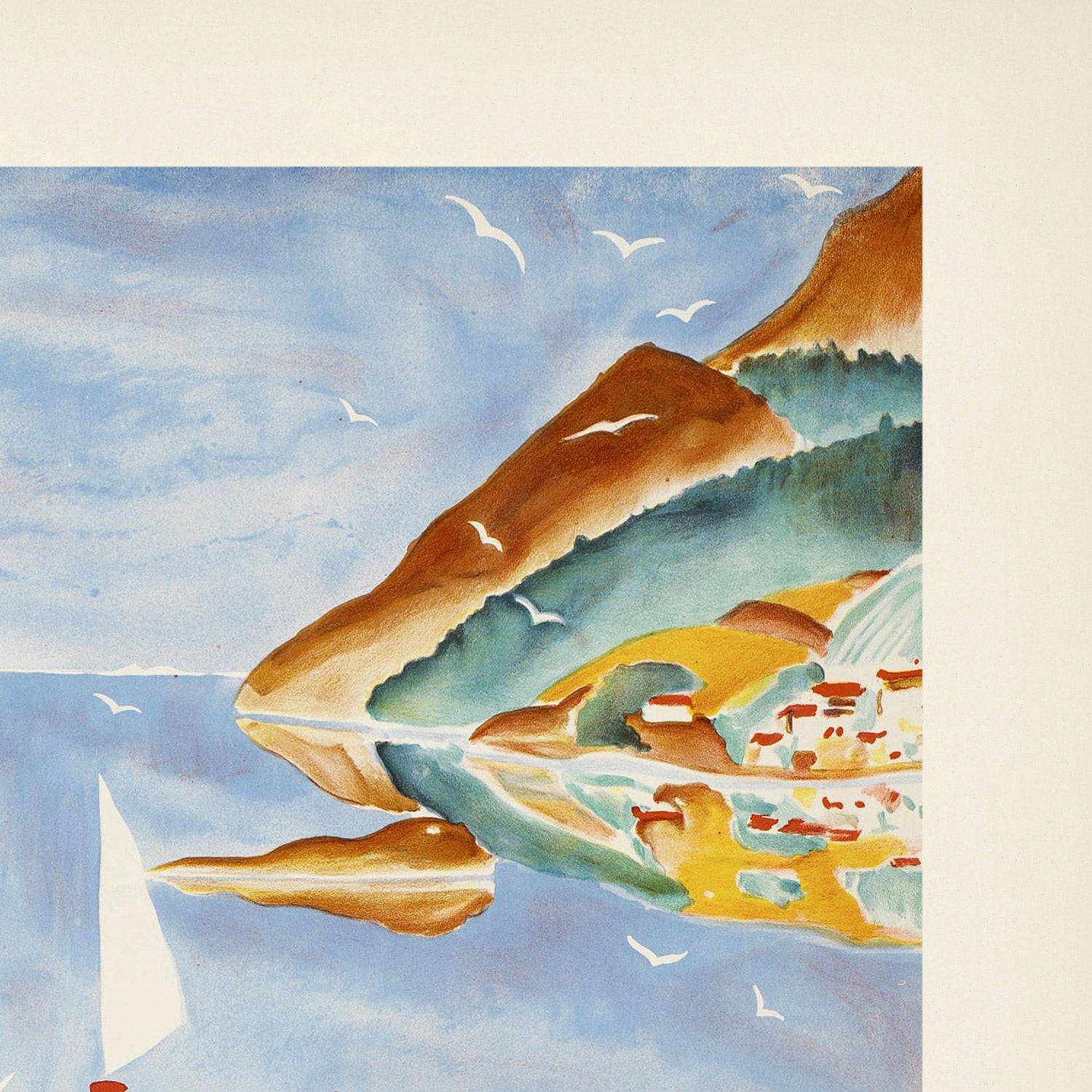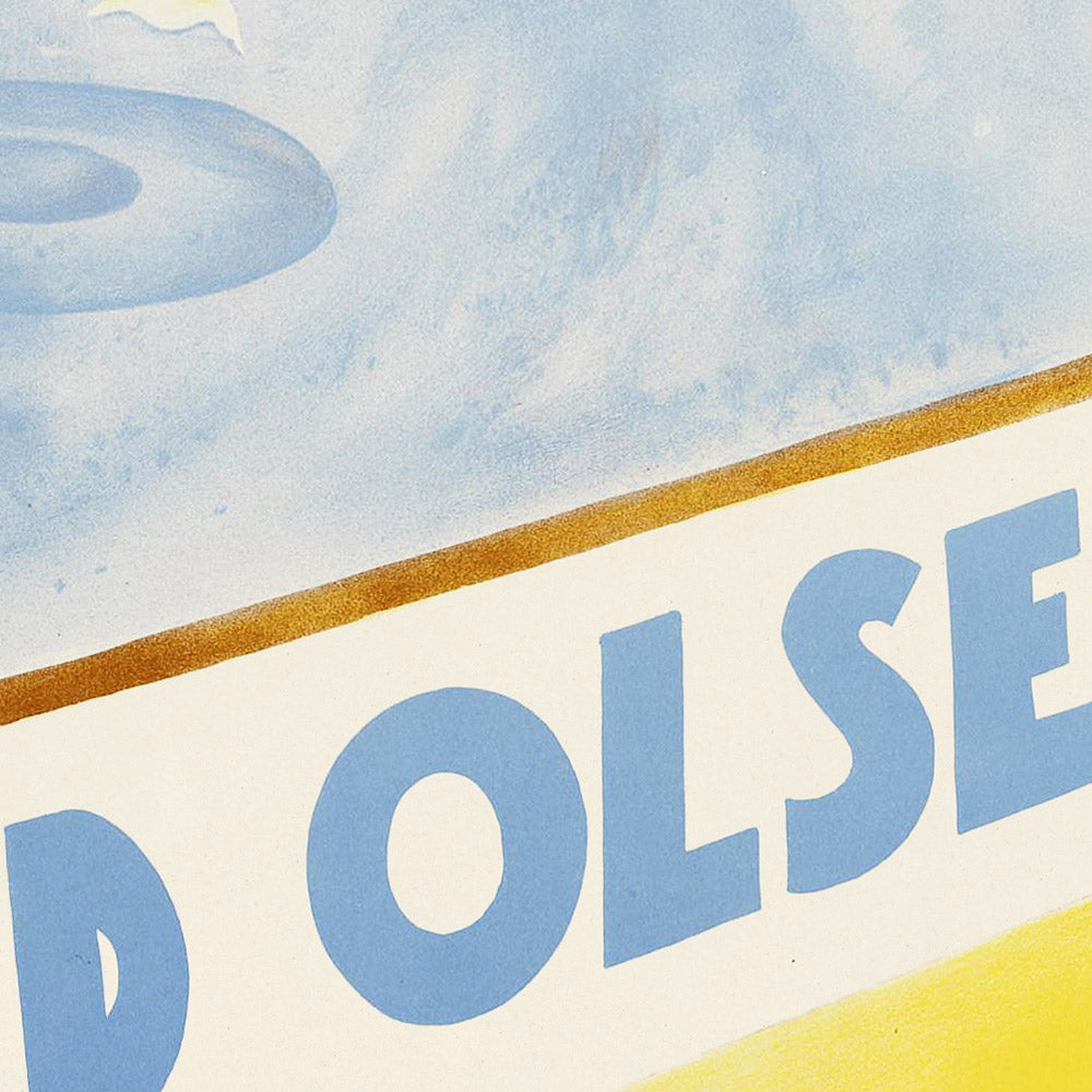 Design and color: The poster is a study in clarity and sunshine. A lemon‑yellow deck floods the lower half in warmth, contrasted by soft blue sky and water, with beige and terracotta accents on the cliffs and lettering. The bold diagonal banner reading “FRED OLSEN LINE” acts almost like a gangway, guiding the eye from the tranquil fjord to the easy life on deck. Its stylized hand lettering—particularly the sculptural ‘36’ and the emphatic ‘NORWAY’—adds a confident, modern rhythm. This is a striking statement piece for anyone who loves Scandinavian design, vintage typography, or the romance of sea travel.