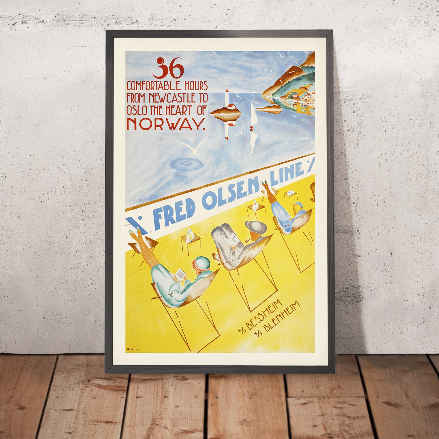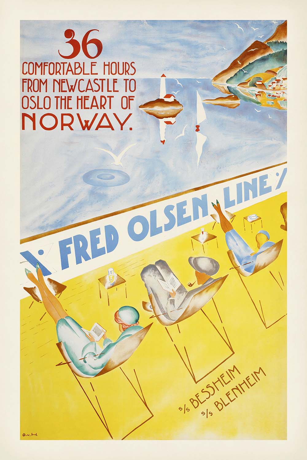 Otto von Hanno’s Fred. Olsen Line is a classic Norwegian travel poster inviting British passengers to sail “36 comfortable hours from Newcastle to Oslo, the heart of Norway.” Likely produced in the interwar era, it captures the romance of crossing the North Sea to the Oslofjord. A crisp diagonal divides the composition: above, a pale blue fjord with mirrored cliffs, tiny harbor houses, and red‑tipped navigation buoys; below, a sunlit deck where three stylish travelers lounge in sling chairs, reading as the ship glides onward. The artist’s monogram “O.v.H.” appears at lower left, and the ships “s/s Bessheim” and “s/s Blenheim” are named at the lower right.