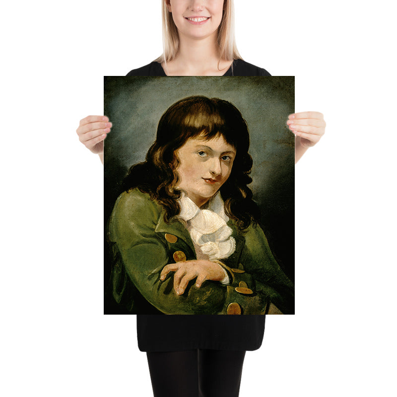 The palette and handling are especially compelling. A deep green coat anchors the composition, while warm notes of yellow and brown animate the complexion and clothing. The background—muted blues and grays—recedes softly, pushing the figure forward with atmospheric grace. Brushwork is confident yet unshowy: you can see more expressive strokes in the hair, while the face remains delicately modeled with soft, rounded forms. It’s a portrait that glows without gloss, making it ideal for spaces that embrace both Georgian restraint and Romantic warmth—think study, library, or an understated living room where nuanced color rewards close looking.