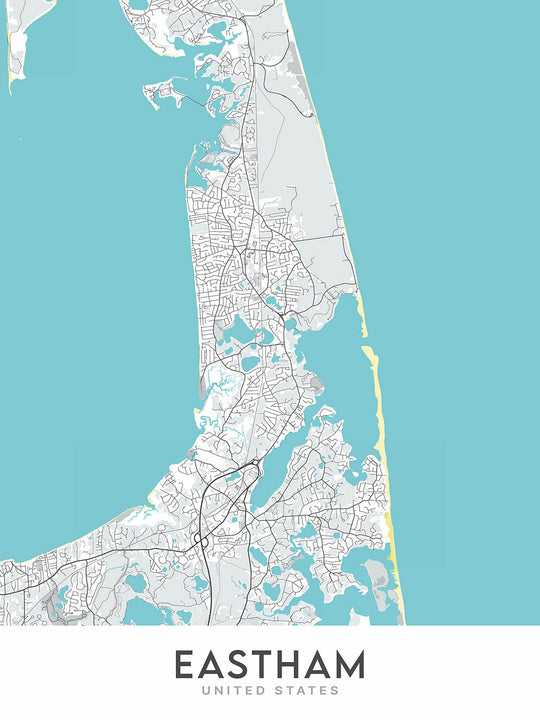 Questa mappa di Eastham è una mappa stradale moderna e dettagliata che presenta una cartografia unica, un design moderno e una palette di colori unica. Questa mappa si concentra sulla città di Eastham nel Massachusetts e sulle aree circostanti, comprese le città di Orleans, Wellfleet e Truro. La mappa copre un'area di circa 11 miglia da ovest a est e 14 miglia da nord a sud, con la città di Eastham approssimativamente al centro.