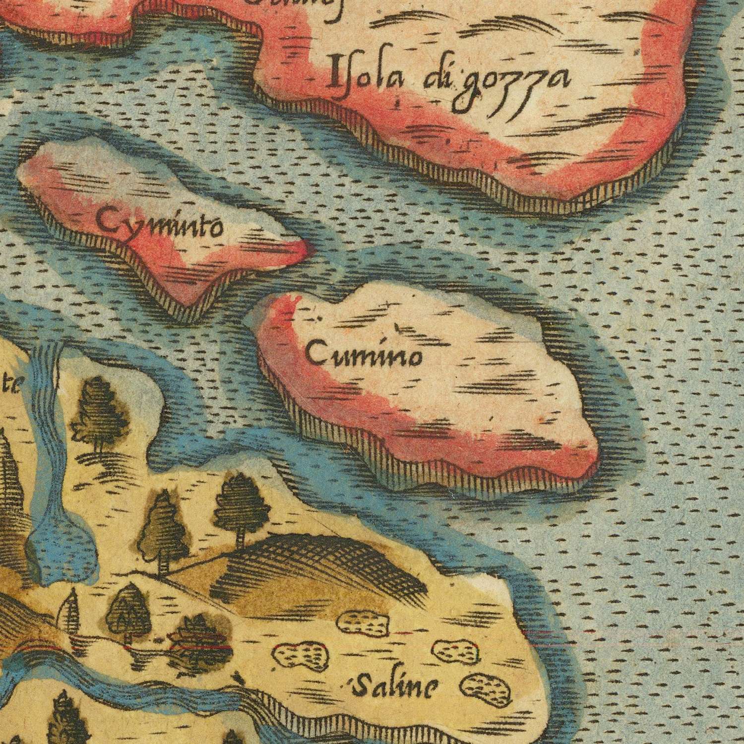 Camocio frames the main island of Malta in commanding relief, with Camino (Comino) riding mid-channel and the near shore of Gozo—its capital Rabat (now Victoria)—visible across the strait. High hills and incised valleys articulate the spine of Malta, culminating at dignified Mdina, the island’s former capital, perched above the fertile central plain. The eastern littoral is a choreography of harbors and promontories: Birgu and Senglea straddle the Grand Harbour, while the headland opposite Sliema hints at the future site of Valletta. Northward, Mellieħa anchors the approaches to St. Paul’s Bay, and the winding coves toward Marsala (modern Marsaskala) register the island’s scalloped coast. Around them, lively galleys animate the surrounding seas.
