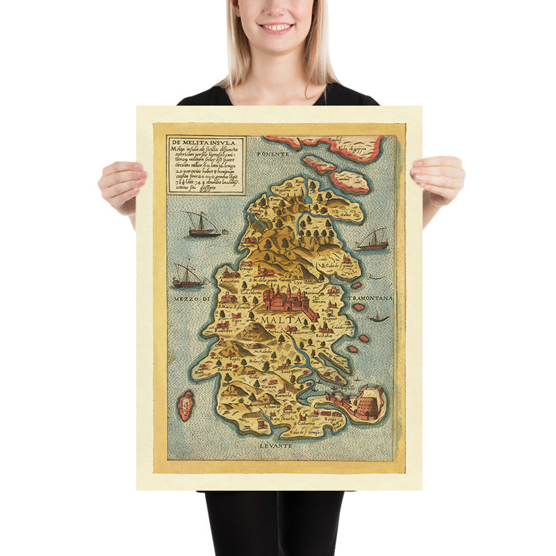 Giovanni Francesco Camocio—Venetian publisher-cartographer of the Lafreri School—excelled at transforming current intelligence into elegant, information-dense images. His celebrated Isole famose and related series distilled the geopolitics of the age with an engraver’s finesse; here, adapting the Dillingen model, he deepens the political and physical portraiture of Malta with meticulous place-names, clear relief, and a masterly cartouche. Noteworthy in sixteenth-century cartography for the balance of topographic truth and strategic emphasis, this work is also vanishingly scarce: examples have not surfaced on the market for more than thirty years. As an artifact, it unites rarity and relevance; as a vision, it fixes Malta at the instant before siege and transformation, with Mdina, Birgu, Senglea, and Fort Saint Angelo standing sentinel over the narrow seas.