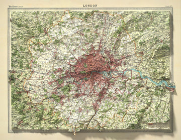 Questa mappa è un tesoro di informazioni, splendidamente rappresentata in colori vivaci che differenziano le sue diverse caratteristiche. Il rilievo è elegantemente rappresentato da contorni e altezze dei punti, rendendo facile visualizzare i paesaggi ondulati che caratterizzano i sobborghi della città. La mappa copre un'area estesa, inclusi parti di Middlesex, Essex, Surrey e Kent, avvolgendo lo spettatore nell'ampia portata di Londra dell'epoca.
