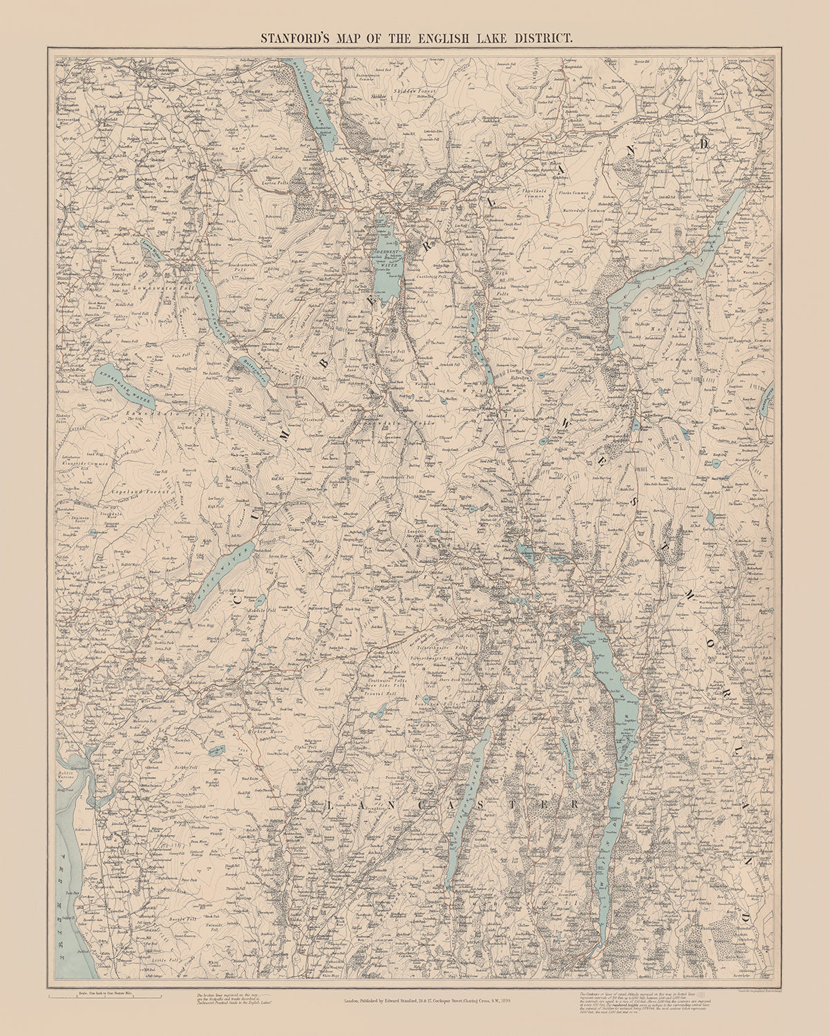 Edward Stanford, una figura prominente nel mondo della cartografia, era rinomato per la sua precisione e dedizione all'accuratezza. Le sue mappe erano molto apprezzate per i loro dettagli e affidabilità, rendendole strumenti indispensabili per esploratori e studiosi. La creazione di questa mappa nel 1899 coincise con un periodo in cui il Distretto dei Laghi stava guadagnando popolarità come meta per turisti e appassionati di attività all'aperto, attratti dai suoi paesaggi mozzafiato e dalle sue acque serene.