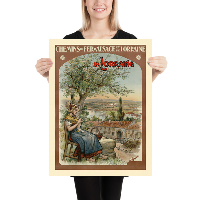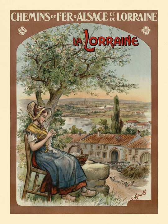 Paul-Adolphe Kauffmann’s Chemins de Fer d’Alsace et de Lorraine: La Lorraine invites the viewer into the pastoral heart of eastern France. In this Belle Époque travel poster, a young woman in regional dress sits beneath a fruit-laden tree, quietly working a length of lace while a farm courtyard hums behind her—chickens peck near a hayrick and a cart, and a river and distant cathedral glimmer on the horizon. The red, curved lettering “La Lorraine” rises through the foliage, tying the scene directly to the railway that promoted the region to holidaymakers.