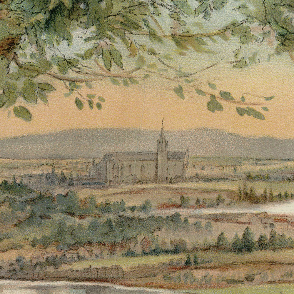 Design-wise, the piece is a masterclass in harmony. A palette of natural greens, warm beige, and earthy browns anchors the poster, while the terracotta roofs and the vivid red of the “La Lorraine” title add balanced pops of color. The arched vignette and stylized floral corner motifs frame the scene with gentle Art Nouveau elegance, while the sinuous typography and subtle blue-greys of the skirt and river lend depth and movement. It’s an evocative work for anyone who loves vintage French railway style, pastoral landscapes, or has personal ties to Lorraine.