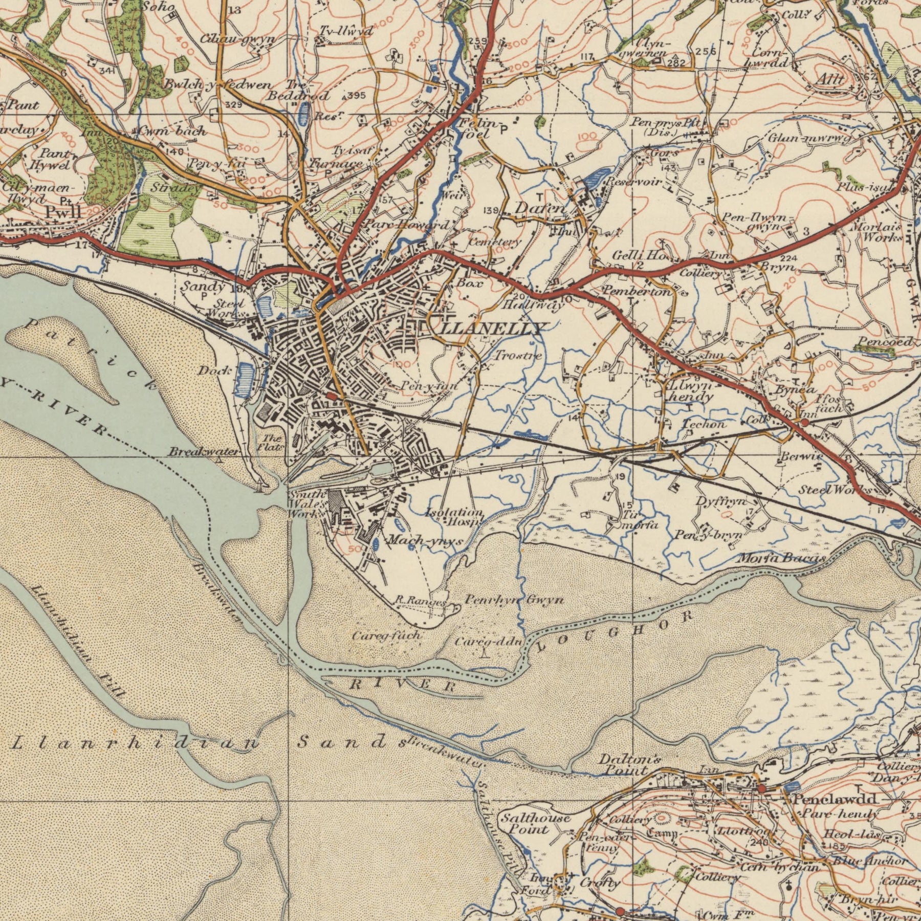 • Llanelly: La posizione centrale della mappa, un'importante città storica nel Carmarthenshire.