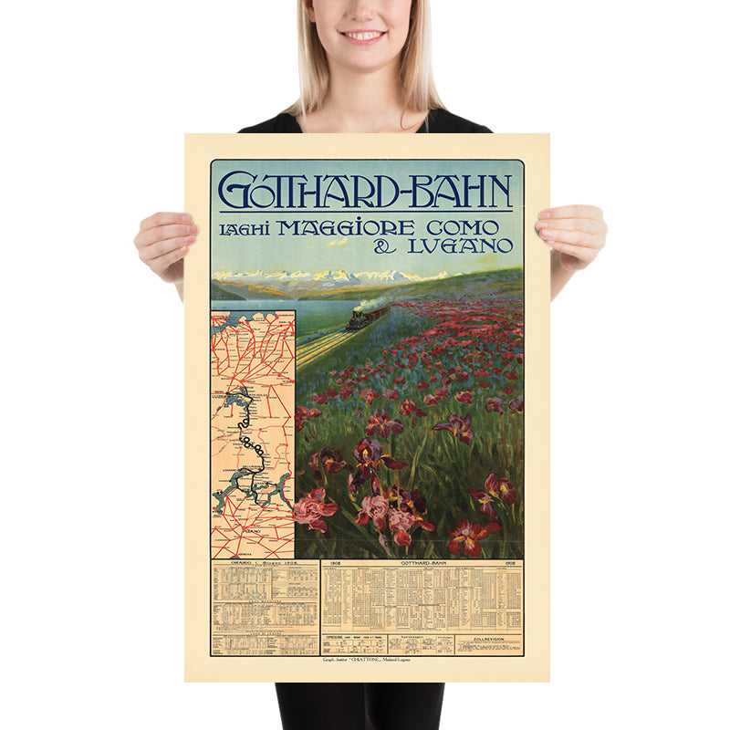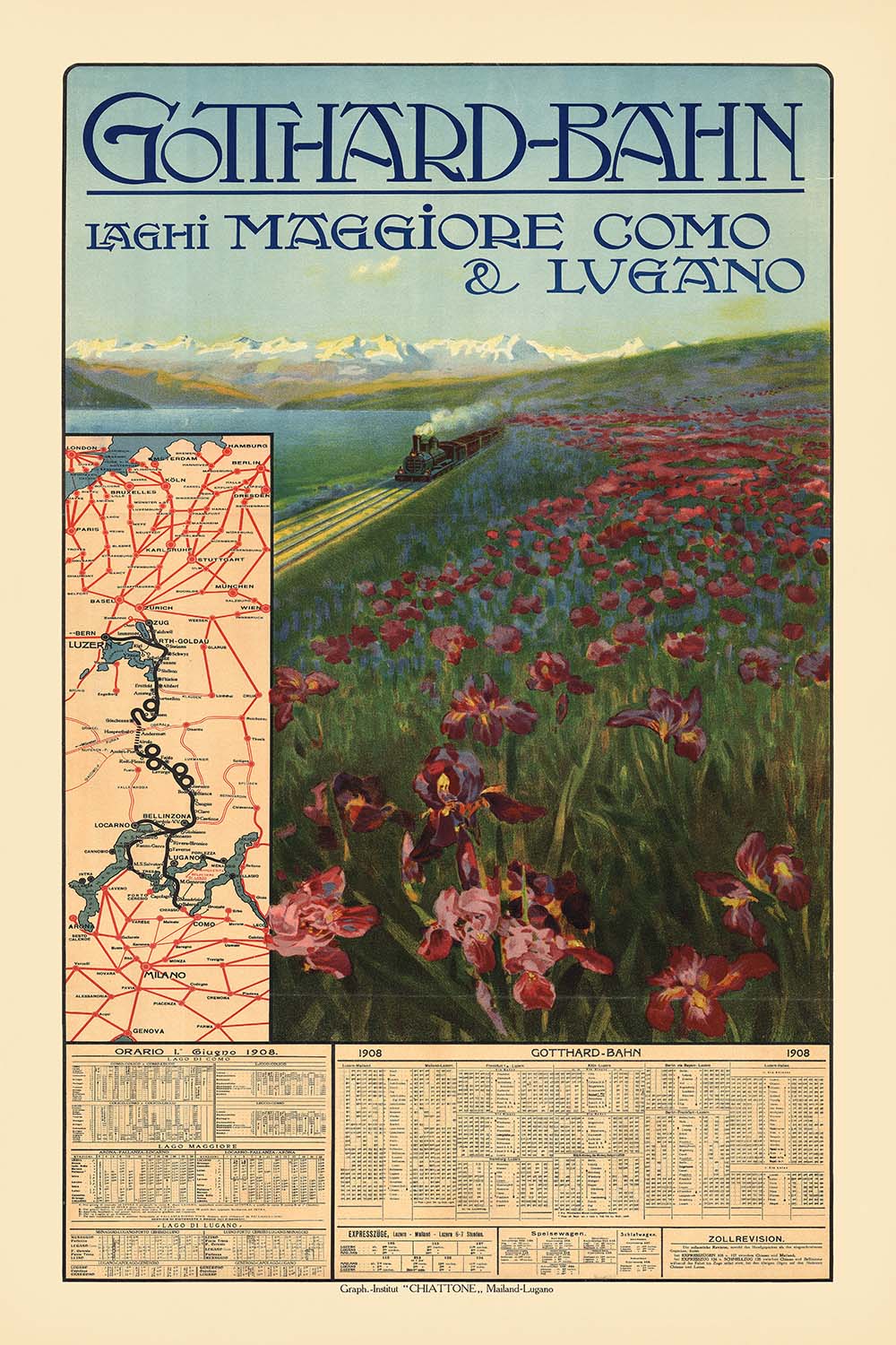 Gotthard-Bahn, Laghi Maggiore, Como e Lugano by Gabriele Chiattone (1908) captures the romance of Belle Époque travel to the Italian Lakes. Created to promote the Gotthard Railway’s services from Switzerland into Lombardy, the poster pairs elegant typography with a lyrical landscape: a small steam train curves along a sunlit hillside, while a sweep of bearded irises in crimson and violet fills the foreground and snow-capped Alps hover across an azure lake. An inset route map and full summer timetable anchor the image in real journeys—note the clearly printed “Orario 1° Giugno 1908” and place names such as Zürich, Luzern, Bellinzona, Lugano, Locarno, and Milano (here shown as “Mailand”).