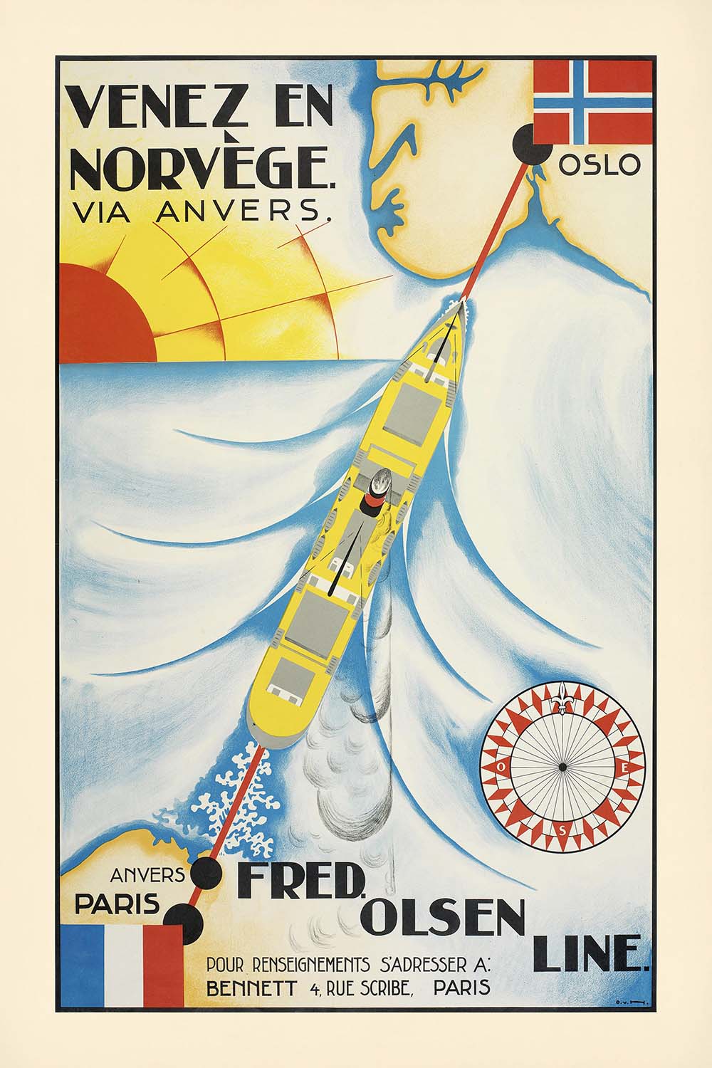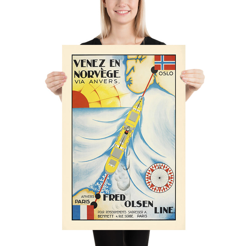 The subject is the celebrated Fred. Olsen Line, a Norwegian shipping company that helped connect continental Europe to Scandinavia during the interwar boom in tourism. The French headline “Venez en Norvège. Via Anvers.” speaks directly to travelers from Belgium and France, while the cartographic silhouette and compass rose signal navigational assurance and adventure. The poster’s multilingual cues and clean mapping make it an evocative artifact of European travel culture.