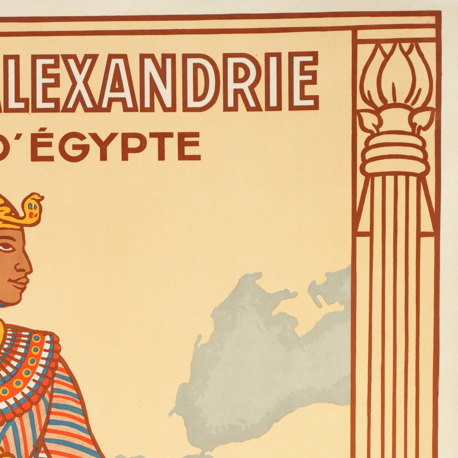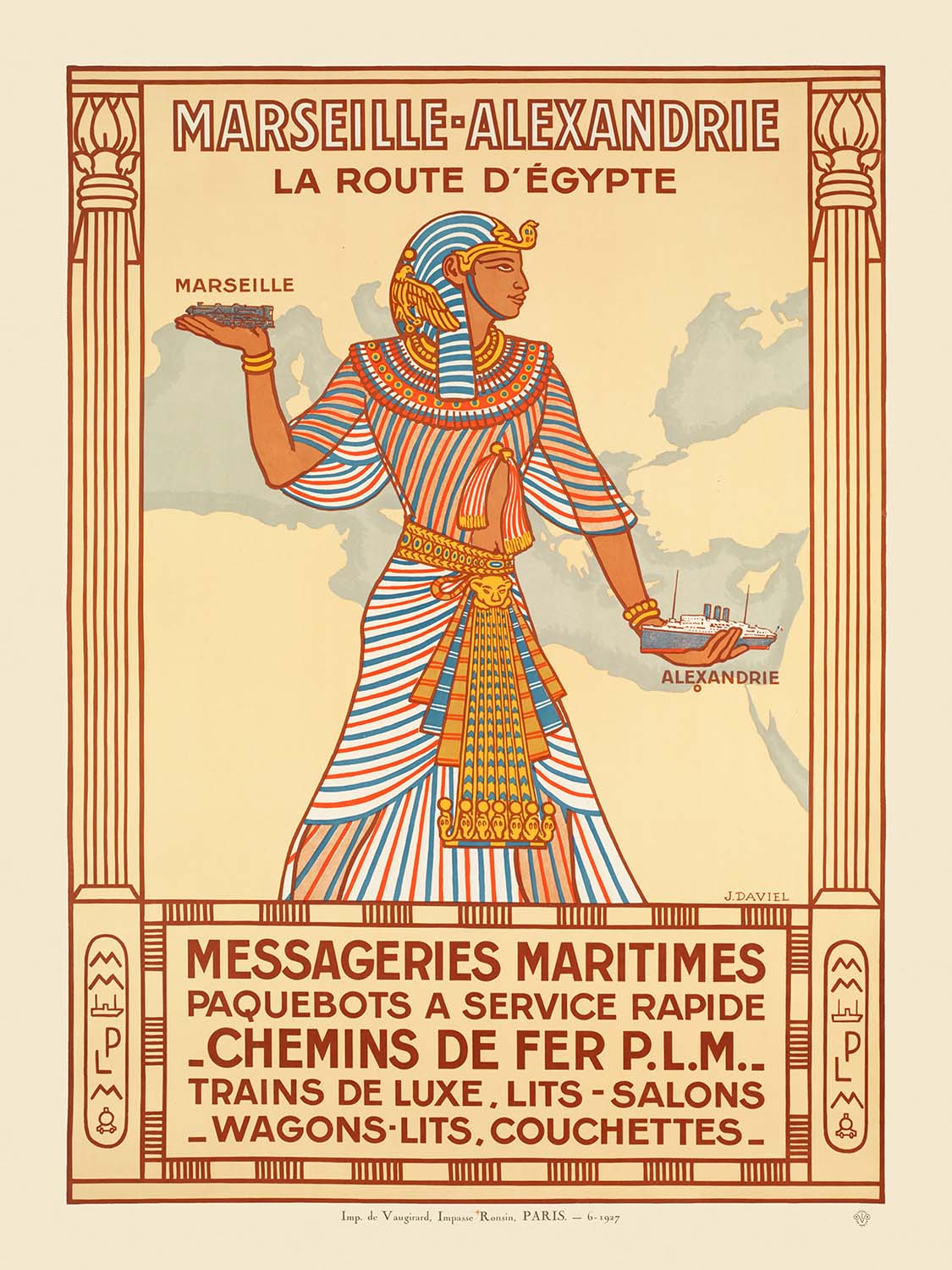 Why this subject matters: The 1920s saw a surge of Egyptomania following headline-making archaeological discoveries, and this route—Marseille to Alexandria—embodied the promise of swift, glamorous passage across the Mediterranean. The poster functions as both advertisement and cultural time capsule: an emblem of steamship-era optimism, international exchange, and the allure of Alexandria’s harbors, cafés, and layered history. Its bold sans‑serif typography and concise headline deliver irresistible clarity: a direct call to voyage La Route d’Égypte.