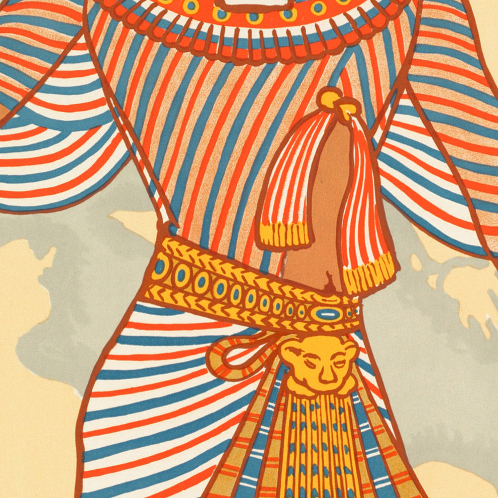 Design and color you’ll love: Against a warm beige ground, saturated accents of red and blue (with turquoise and gold highlights) create a striking, sun-baked palette that reads beautifully in contemporary interiors. Intricate vertical patterning in the figure’s garments, a crisply faceted headdress, and jewelry reduced to geometric forms are quintessential Art Deco gestures—sleek, stylized, and eminently collectible. The clean lines and balanced symmetry make this poster a statement piece for an entryway, study, or living room, pairing especially well with natural woods, brass, and rattan, and adding a world-traveled note to modern or eclectic spaces.