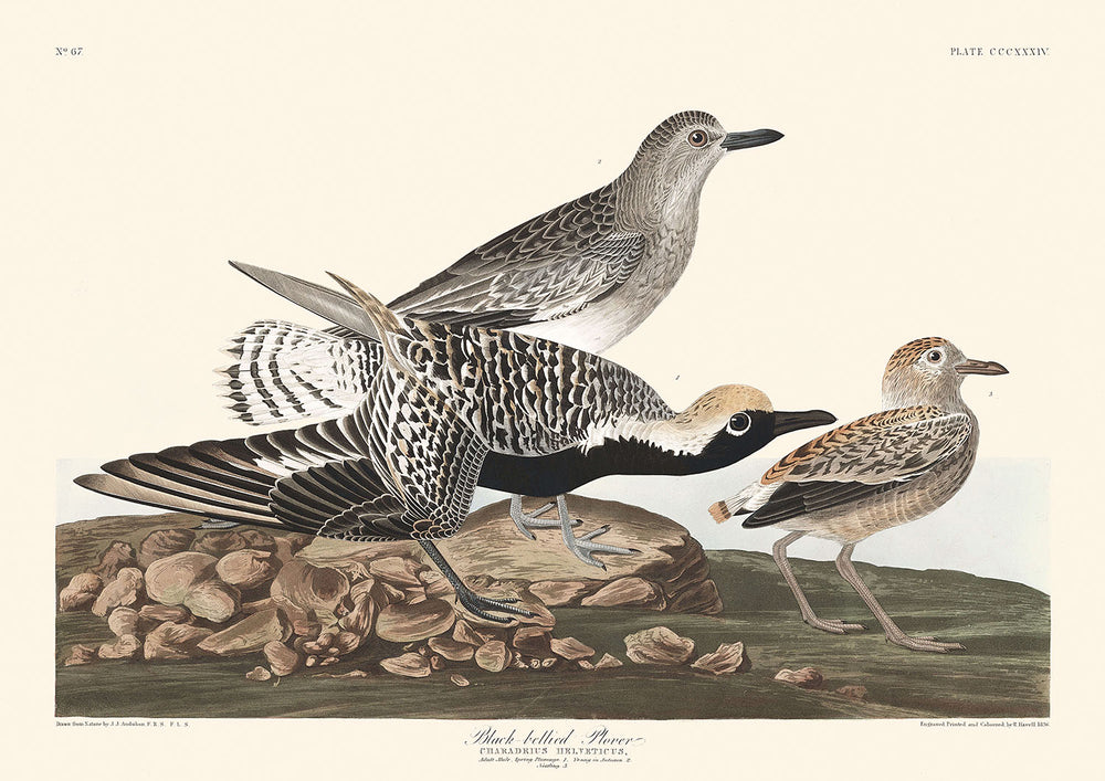 Il "Plover dalla pancia nera (Tavola 334)" di John James Audubon, pubblicato per la prima volta nel 1827, è un'illustrazione straordinaria della rinomata serie di Audubon, Gli Uccelli d'America. Questo squisito studio sugli uccelli cattura la bellezza e l'essenza del Plover dalla pancia nera nel suo habitat naturale.