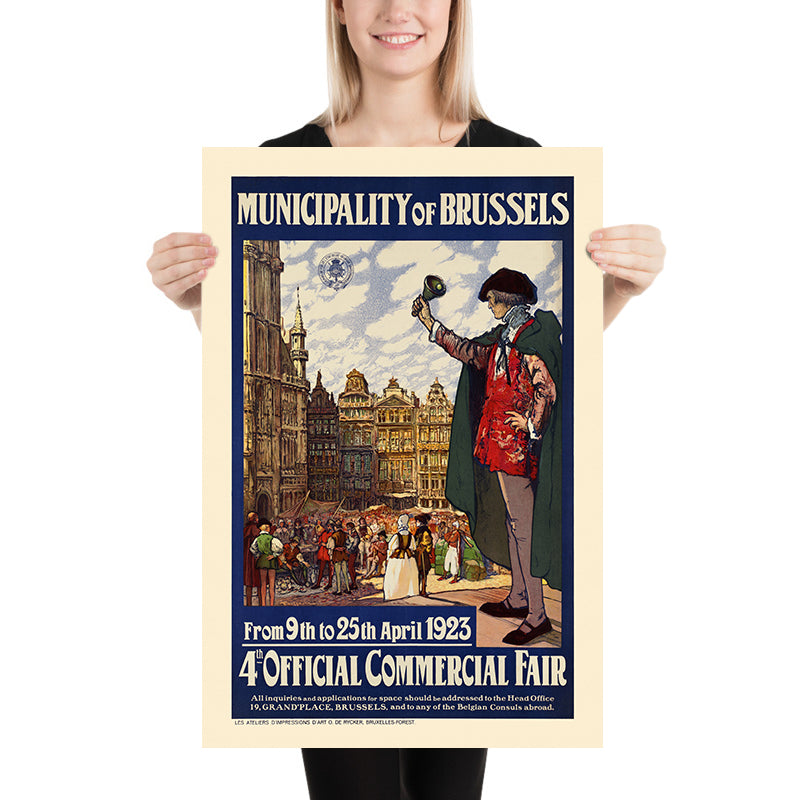Municipality of Brussels. 4th Official Commercial Fair is a classic European travel and events poster from 1923, issued by the city at a pivotal moment of post–First World War renewal. The artist’s name is lost to history, but the work embodies the refined poster craft for which Belgium was renowned—marrying elegant ornament with clear civic messaging. With a proud town-crier figure and decorative architectural motifs, the composition celebrates Brussels’ commercial dynamism and communal spirit as the capital reintroduced itself to residents, traders, and visitors across the continent.