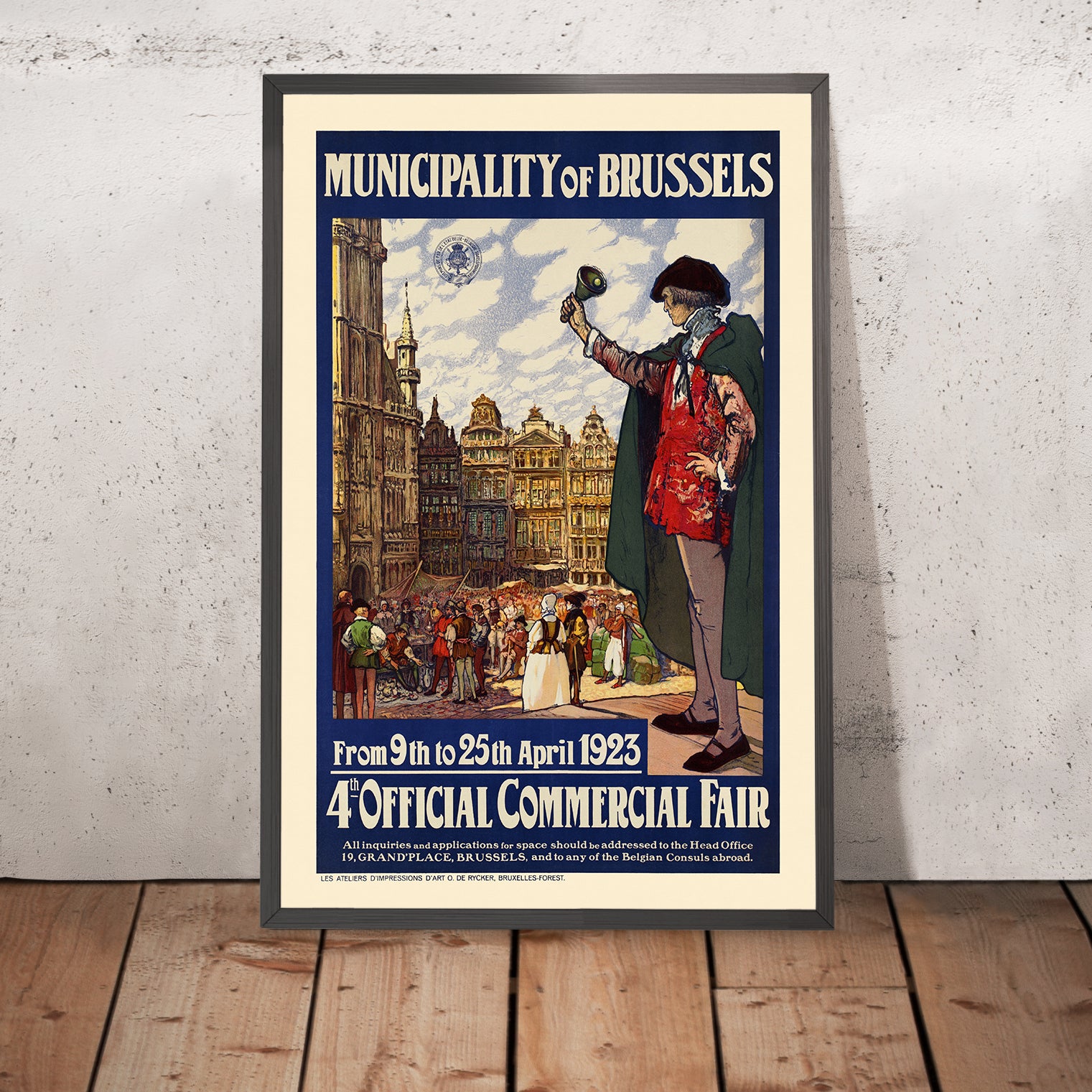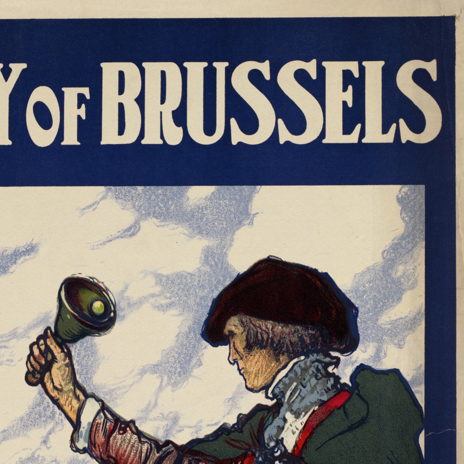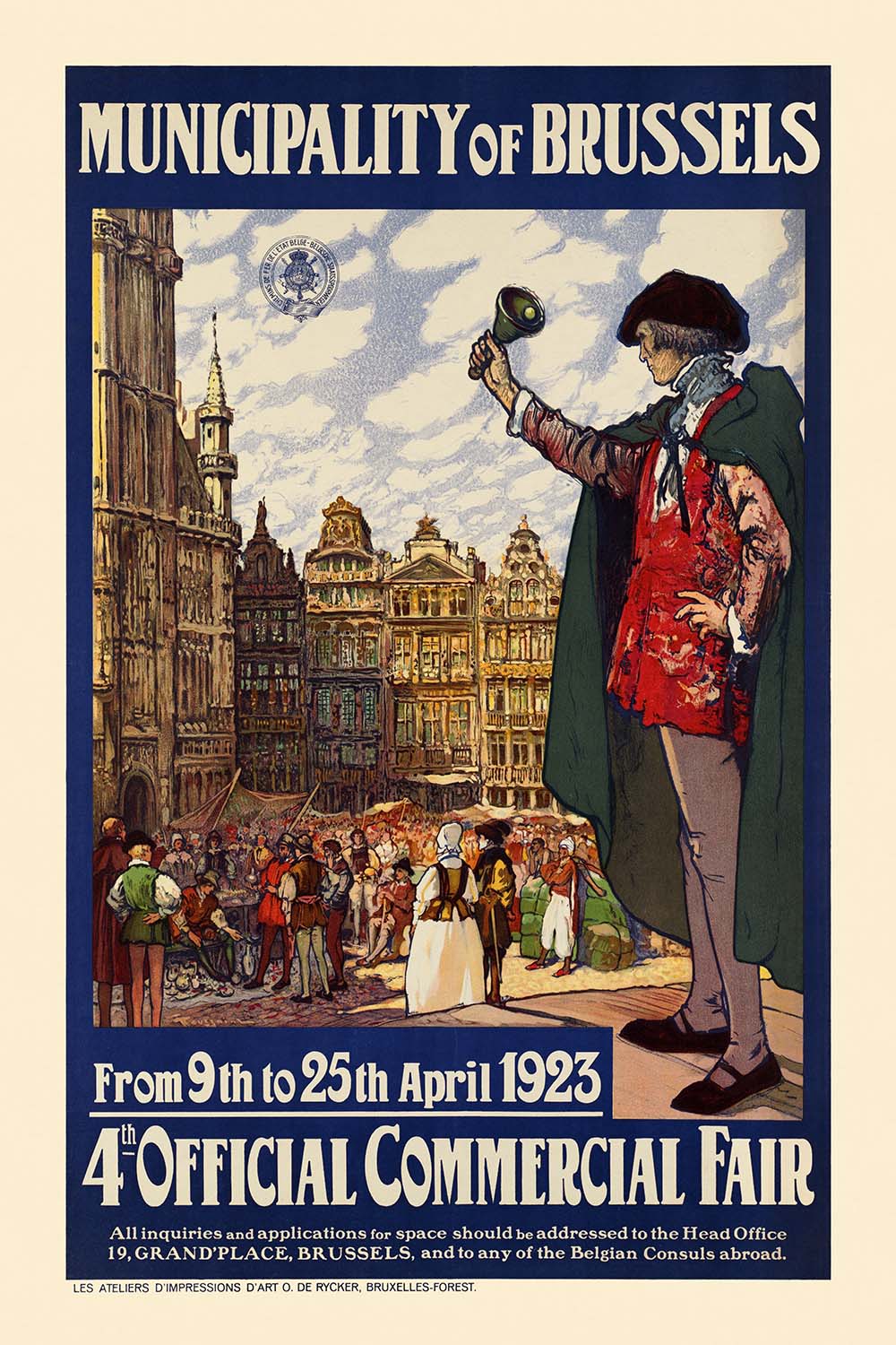 The subject itself is historically resonant. The “4th Official Commercial Fair” speaks to Brussels’ effort to reignite trade, showcase manufacturers, and welcome international buyers in the early 1920s. The town-crier—raised bell in hand—serves as a symbol of civic voice and marketplace bustle, a personification of the city calling people back to its boulevards, guilds, and workshops. In an age before mass digital media, such posters were the city’s public stage—equal parts advertisement and cultural announcement.