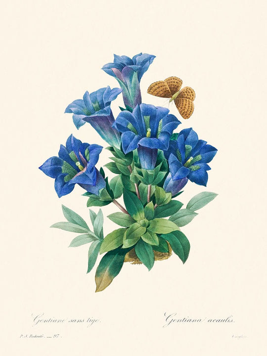 La Gentiana Acaulis, realizzata dal celebre artista botanico Pierre-Joseph Redouté, rappresenta un brillante testamento all'arte dell'illustrazione botanica dell'inizio del XIX secolo. Pubblicata nel 1802, quest'opera cattura la delicata bellezza della Gentiana acaulis, una specie rinomata per i suoi vivaci fiori blu, ed è ora disponibile come stampa d'arte di alta qualità.