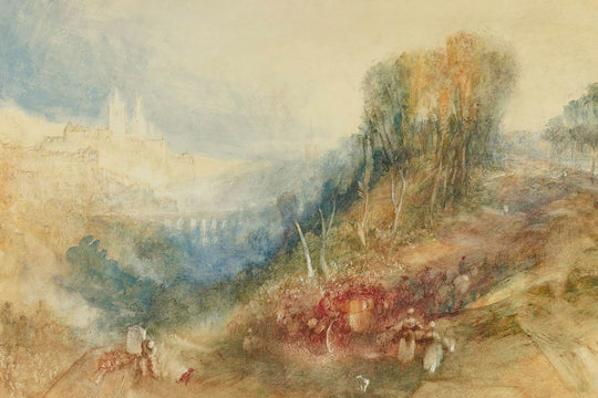 L'uso notevole di colore e stile in quest'opera dimostra l'approccio lungimirante di Turner alla pittura, con il giallo che rappresenta il calore luminoso del sole, bilanciato delicatamente dai blu freschi del cielo e dai rossi audaci che evidenziano sottilmente gli elementi architettonici all'interno del paesaggio. Possedere una stampa di questo capolavoro va oltre l'attrattiva estetica; offre uno sguardo al genio di Turner e al suo impatto duraturo sull'evoluzione della pittura paesaggistica.