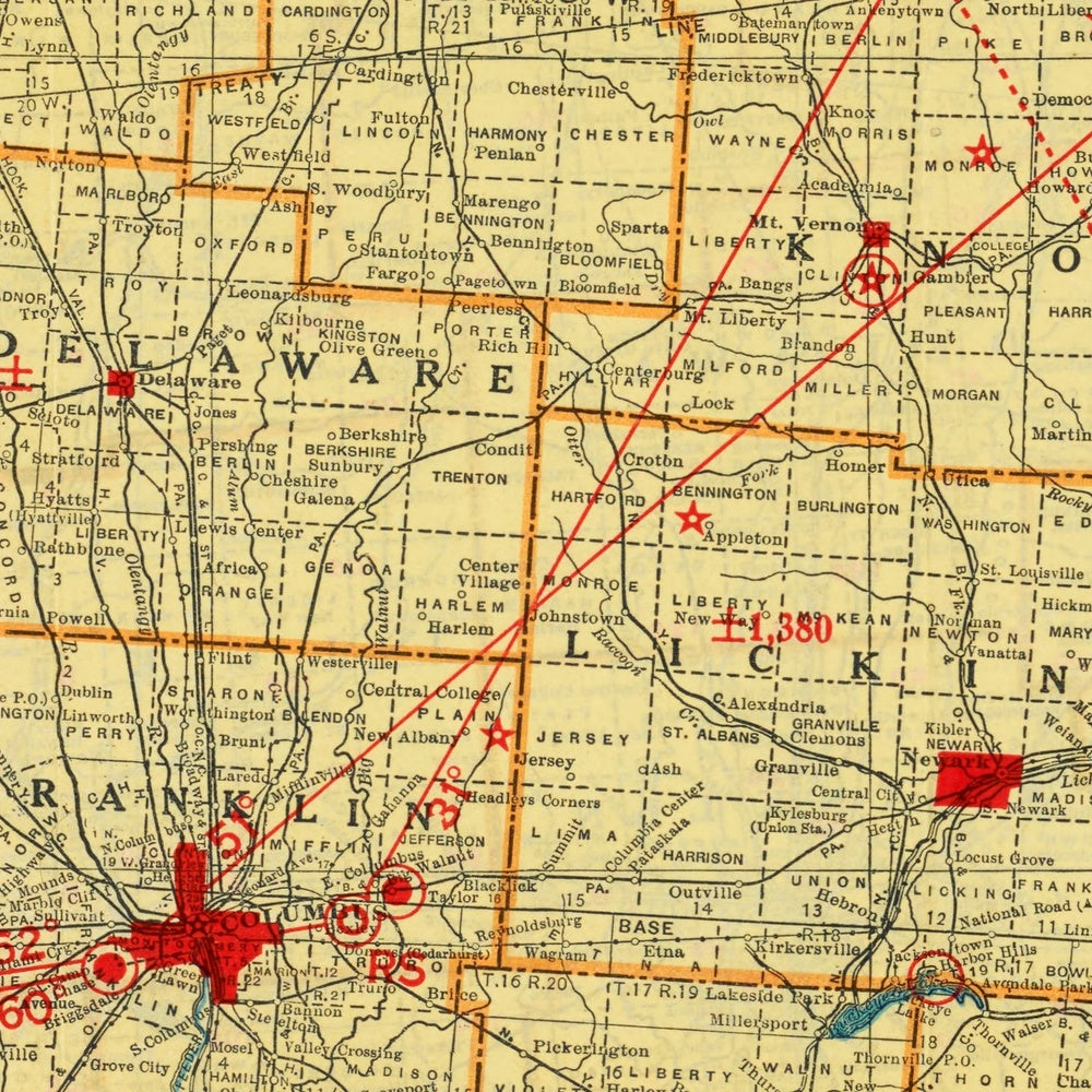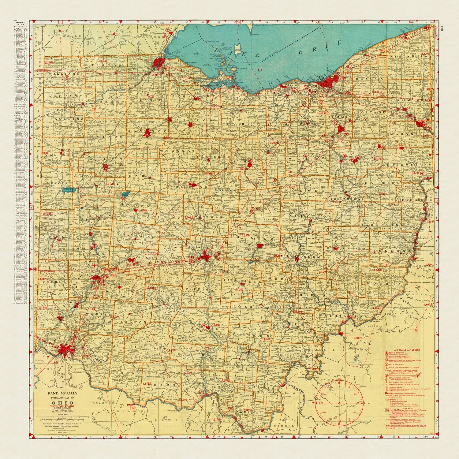 Rand McNally standard map of Ohio with air trails captures a pivotal moment in 1929, when the nation’s airways began to knit themselves into the familiar web of roads and rails. Across the entire Buckeye State, counties are crisply delineated in color, their borders keyed to a precise legend that brings instant clarity to an otherwise dense portrait of movement. Major cities and towns stand out in red, with the state capital, Columbus, emphatically marked as a political and geographic anchor. Airports and seaplane ports receive their own symbols, while the air trails—meticulously distinguished between lighted and unlighted routes—trace new aerial corridors above a mature ground network. Railroads, electric railways, and a hierarchy of U.S. routes and county highways round out a sophisticated, multi-modal picture of Ohio on the eve of modern travel.