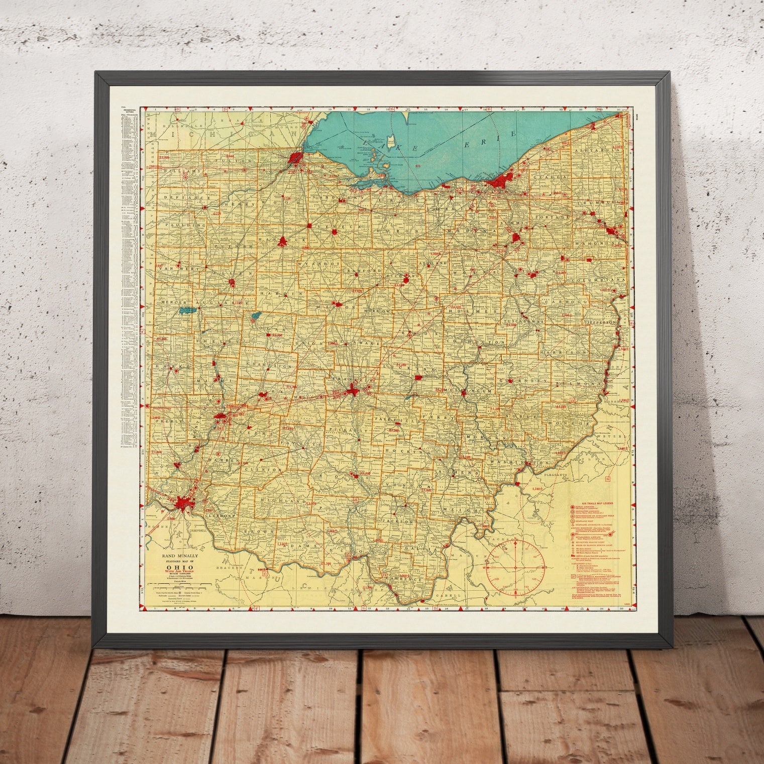 Produced by Rand McNally & Company—America’s preeminent popular cartographer since the nineteenth century—the map exemplifies the firm’s talent for transforming complexity into legible, elegant order. Clean county tints, disciplined typography, and intuitive symbols deliver the crisp utility that made Rand McNally indispensable to motorists, rail travelers, and, increasingly, aviators. The design signals a confident modernity: air trails share equal billing with steam-era rail lines, and roads are arrayed with the methodical assurance of a state thoroughly surveyed. A descriptive index of cities, towns, and counties amplifies usability, while a separate index of U.S. airways projects the map’s logic far beyond Ohio’s borders. Even the pictorial cover—pairing plane and train—announces a new travel era.