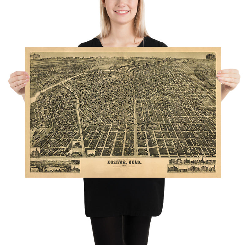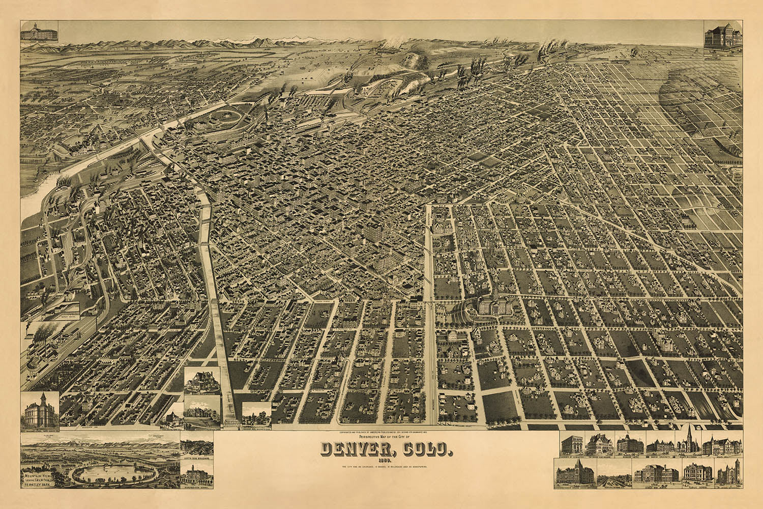 Perspective map of the city of Denver, Colo. 1889 presents Henry Wellge’s sweeping bird’s-eye portrait of a boomtown at full stride, its urban grid fanning out from the confluence of the South Platte River and Cherry Creek. With a dramatic, elevated vantage and an ornate cartouche, Wellge arrays Denver’s avenues and blocks in meticulous, light-dappled detail, revealing a city that has transformed post–Gold Rush ambition into brick, stone, and enterprise. The composition clarifies how the ordered lattice of 16th Street through 19th Avenue meets the sinuous course of the waterways, a tension between geometry and topography that shaped Denver’s identity. Across the panorama, smokestacks, spires, and gabled roofs sketch a confident, late-19th-century skyline.