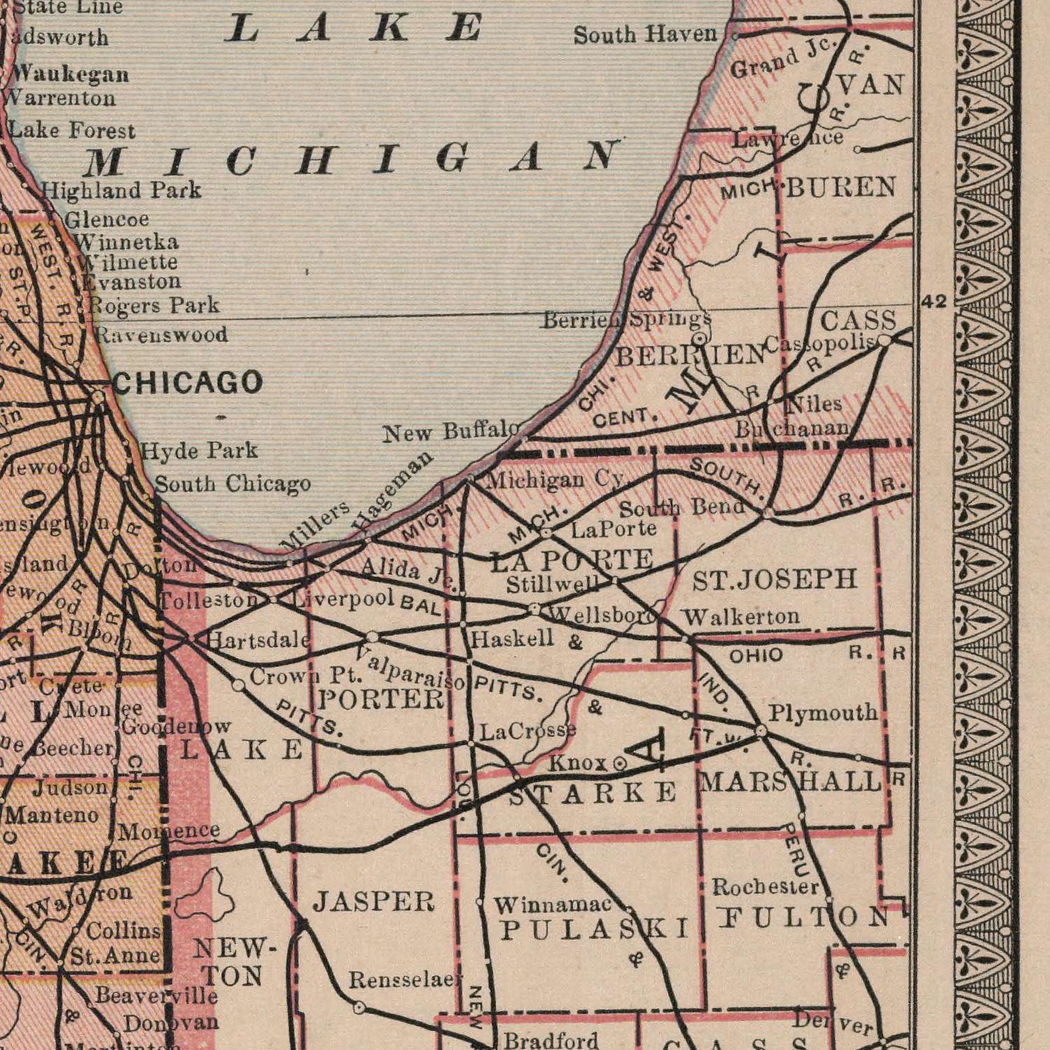 Illinois, published in 1883, captures the Prairie State at a formative moment, poised between frontier memory and industrial might. Issued in the first edition of George Franklin Cram’s ambitious world atlas, it marries precision with accessibility and records the era’s evolving geographic standards by plotting prime meridians from both Greenwich and Washington. The composition balances confident color with instructive detail: each county washed in its own tone and crisply contained by red borders, major towns and routes keyed for immediate orientation. It is a map made to be read and used—by merchants tallying shipments, travelers choosing routes, and citizens taking stock of a rapidly changing landscape—yet it retains an unmistakable elegance. Topography appears as fine hachures, lending dimensionality to a state famed for its level horizons.