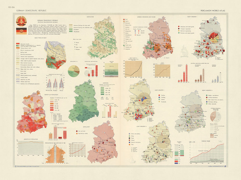 In generale, questa mappa della Repubblica Democratica Tedesca in Infographics è una risorsa preziosa e informativa per chiunque sia interessato alla storia della RDT e all'era della Guerra Fredda. La sua ricchezza di dati e la presentazione visivamente attraente la rendono un must-have per ricercatori, storici e chiunque altro sia interessato a questo affascinante periodo della storia.
