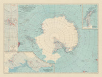 Questa mappa del 1932 dell'Antartide, pubblicata dalla National Geographic Society, è una mappa politica e fisica dettagliata che fornisce una panoramica completa del continente. La mappa è centrata sul Polo Sud e utilizza una Proiezione Azimutale Equidistante, che preserva la corretta distanza dal punto centrale a qualsiasi altro punto sulla mappa. Questa proiezione è particolarmente utile per le regioni polari, poiché minimizza la distorsione comune in altre proiezioni.