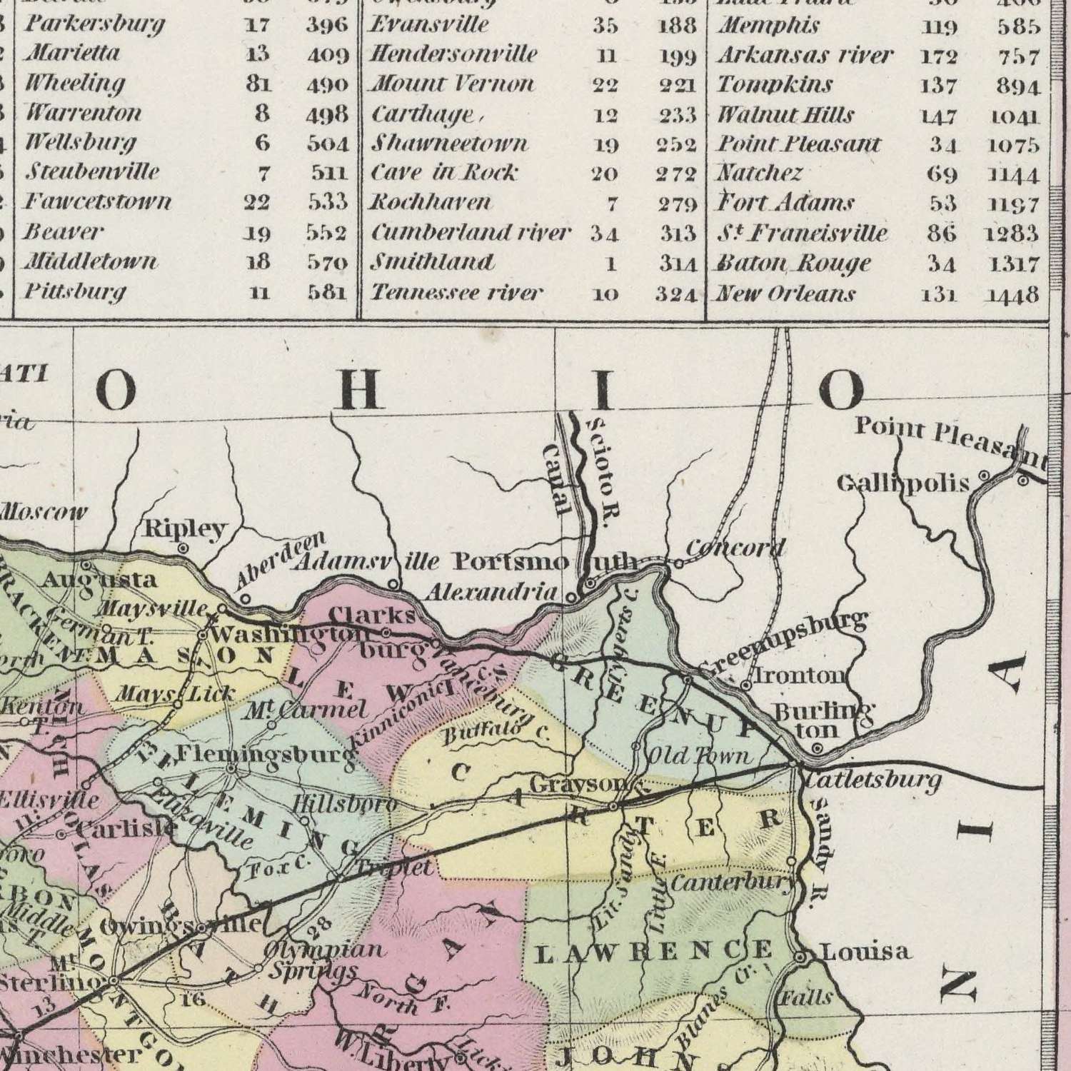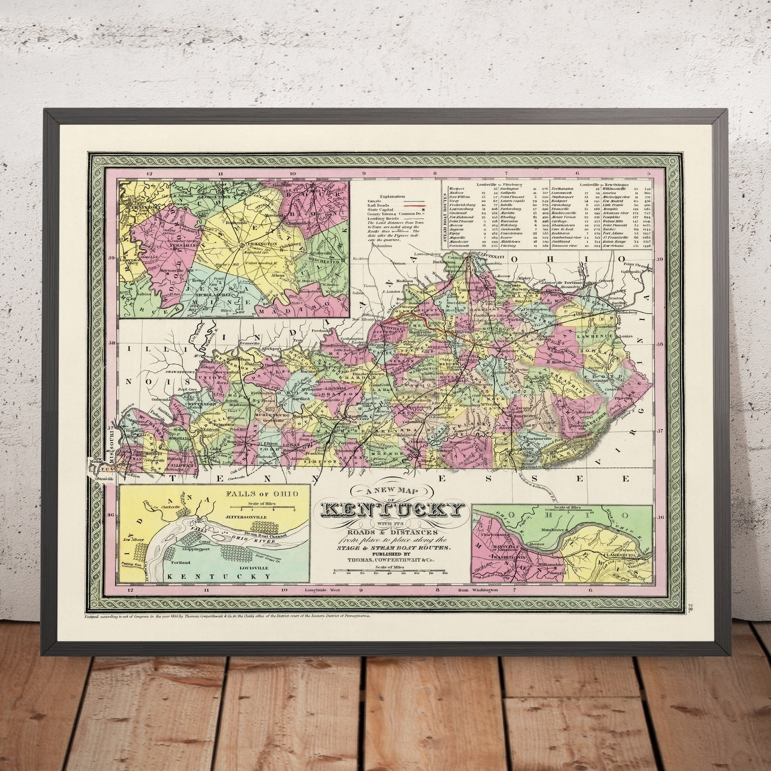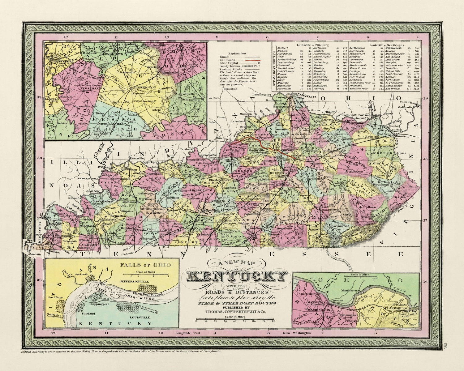 Samuel Augustus Mitchell stands among the nineteenth century’s most influential American cartographers, renowned for marrying accuracy to accessibility. His 1855 Kentucky reflects a practice he and his publishers, Thomas, Cowperthwait & Co., perfected: regularly updating atlases so that civic boundaries, transport lines, and towns kept pace with a nation in motion. The decision to fix the prime meridian at Washington underscores an American vantage point—centering calculation, mileage tables, and route descriptions on the capital rather than Greenwich. Clear engraving and strong color wash produce an instantly readable hierarchy, while marginal references to adjoining states situate Kentucky within the greater Ohio and Mississippi valleys. The result is a document equally fit for the countinghouse, the courthouse, and the parlor.