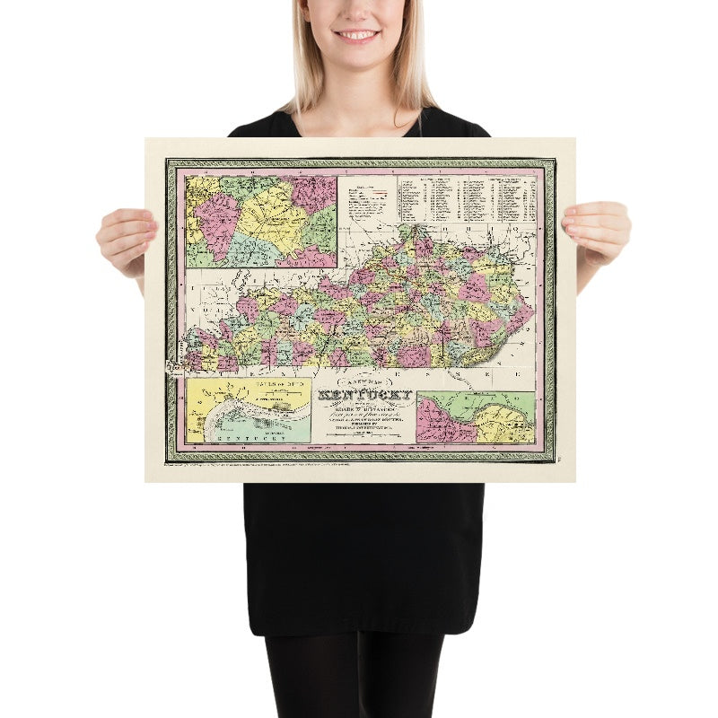 Topography is rendered with hachures that ripple across the sheet, from the rugged eastern highlands to the softly rolling Bluegrass. The Ohio River forms a commanding, serrated boundary to the north, its banks punctuated by Louisville, Covington, Henderson, and other river towns; to the far west, channels lead toward the Mississippi, while southward the line with Tennessee grounds the Commonwealth. Major waterways—the Kentucky, Licking, Green, and Cumberland rivers—meander through counties and across road grids, their valleys clearly modeled by slope and shadow. This union of relief and hydrography makes farming districts, mineral uplands, and travel corridors instantly legible. Even the iconic impediment at the Falls of the Ohio appears with contextual detail, fusing landscape and livelihood into a single cartographic narrative.