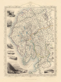 Attorno ai bordi della mappa ci sono incisioni dettagliate di bellissimi panorami del Lakeland, inclusi alcuni di Windermere, il Castello di Lancaster, Keswick e Carlisle.