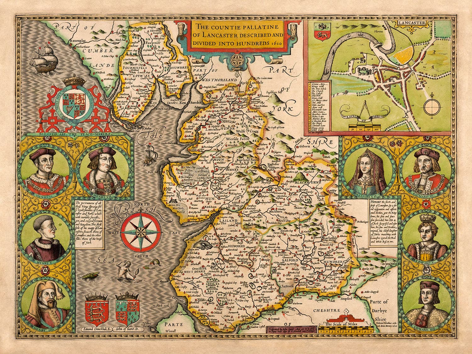 Molti dei paesi, villaggi e città nel Lancashire sono già visibili in questa mappa. Nell'angolo in alto a destra c'è un'incisione dettagliata di Lancaster, allora (e ancora) la capitale di questa antica contea.