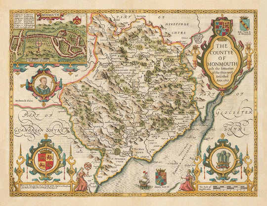 Molti dei paesi, villaggi e città in Monmouthshire sono già visibili in questa mappa, inclusi Abergavenny, Chepstow, Caldicot e altri. Nell'angolo in alto a sinistra c'è una bella incisione dettagliata della città di Monmouth.