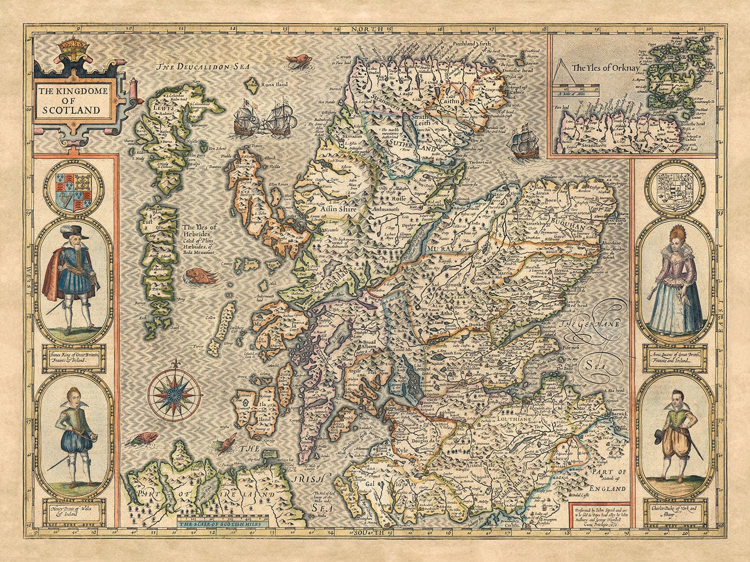 Molti dei paesi, villaggi e città in Scozia sono già visibili in questa mappa. In alto a destra c'è un'incisione in rilievo delle Isole Orcadi. Includono incisioni di vari reali, come il Re Giacomo di Gran Bretagna, Francia e Irlanda, la Regina Anna e il Principe Enrico. Una versione successiva della mappa vedrebbe i reali sostituiti da comuni mortali. Le Isole Shetland, le Ebridi, Skye, Loch Ness, Loch Lomond, Mull of Kintyre... sono tutte qui.
