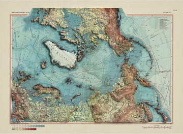 Questa mappa non è semplicemente una rappresentazione geografica, ma anche un documento storico che illustra i percorsi delle spedizioni scientifiche precedenti al 1957. I percorsi incisi sulla mappa sono testimoni silenziosi dello spirito di esplorazione e scoperta che ha caratterizzato l'epoca. L'inclusione di dati batimetrici e topografici aggiunge un ulteriore strato di ricchezza alla mappa, fornendo intuizioni sulle caratteristiche fisiche della regione artica. Lo spettatore può tracciare i contorni del fondale oceanico nell'Oceano Artico e nel Mare di Bering, e visualizzare il terreno accidentato del Canada settentrionale, della Russia settentrionale e della Groenlandia.