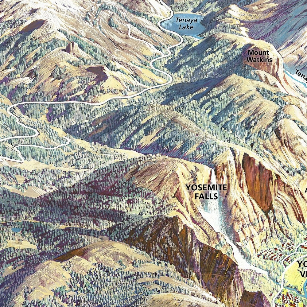At the heart of the scene lies Yosemite Valley, a glacially carved sanctuary where the Merced River winds among meadows and talus. The sheer faces of El Capitan and Half Dome anchor the panorama, their lines heightened by light and shadow to reveal structure and scale. Opposite, North Dome, Sentinel Dome, and Glacier Point map a constellation of vantage points, while Yosemite Falls and Bridalveil Fall cascade in silver threads that animate the granite amphitheater. Roads and trails are elegantly traced, offering orientation without disrupting the sense of wilderness. Labels pinpoint key formations, and Berann’s cloud work subtly lifts the eye from valley floor to rim, conveying both elevation and the drama of changing weather.