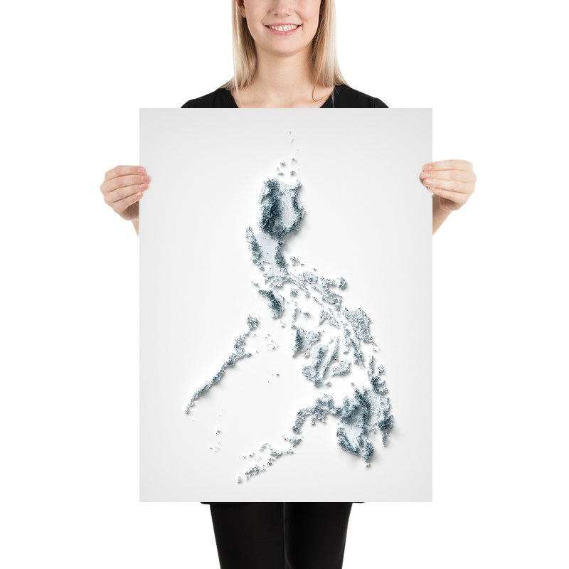 This is a minimalist topographical relief map of the Philippines, created by The Unique Maps Co. and enhanced with our trademarked Unique 3D process. There are no labels, no roads, and no towns — just the islands themselves, sculpted by light and shadow so you can read peaks, ridges, valleys, and wide river plains at a glance. Long raking highlights pick out mountain spines; soft, even shading reveals the lowlands and broad alluvial flats; sharp, conical silhouettes betray the country’s famous volcanoes.