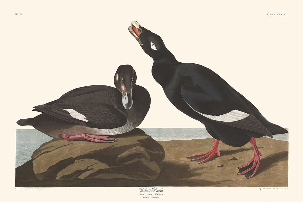 L'uso del colore di Audubon in questa illustrazione è particolarmente impressionante, con i neri profondi e vellutati dell'anatra che contrastano magnificamente con le sue caratteristiche bianche, rappresentando i segni unici del Velvet Duck con precisione e grazia. Quest'opera non è solo una testimonianza della bellezza naturale di questi uccelli ma serve anche come un pezzo affascinante per qualsiasi appassionato d'arte o amante degli uccelli da possedere.