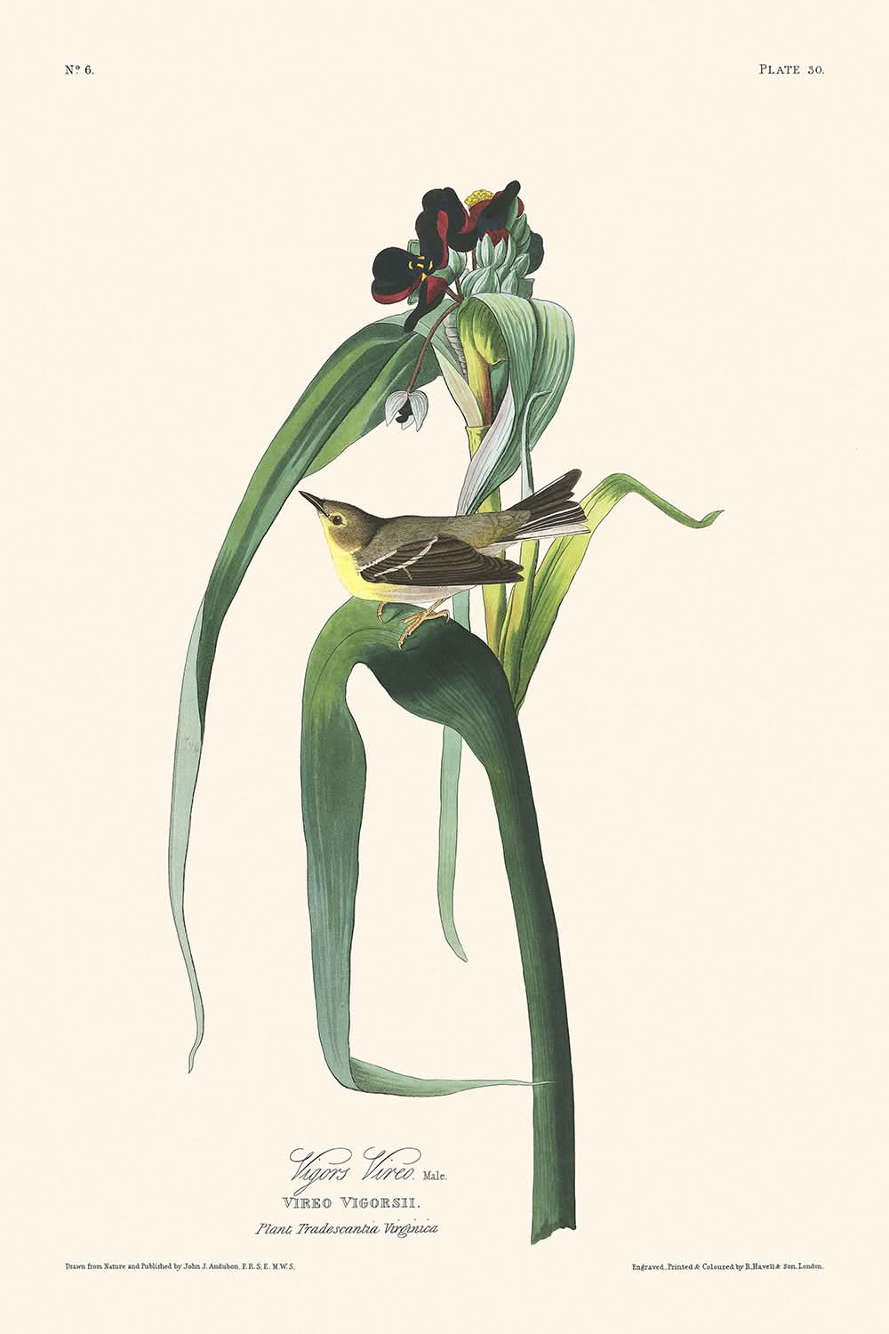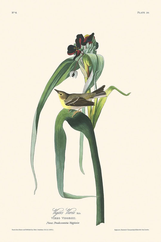 Il nome scientifico per questa specie presentato nella raffigurazione di Audubon è Vireo philadelphicus, comunemente noto come il Vireo di Philadelphia, mostrando l'incredibile accuratezza e la ricca qualità realistica per cui Audubon era celebrato.