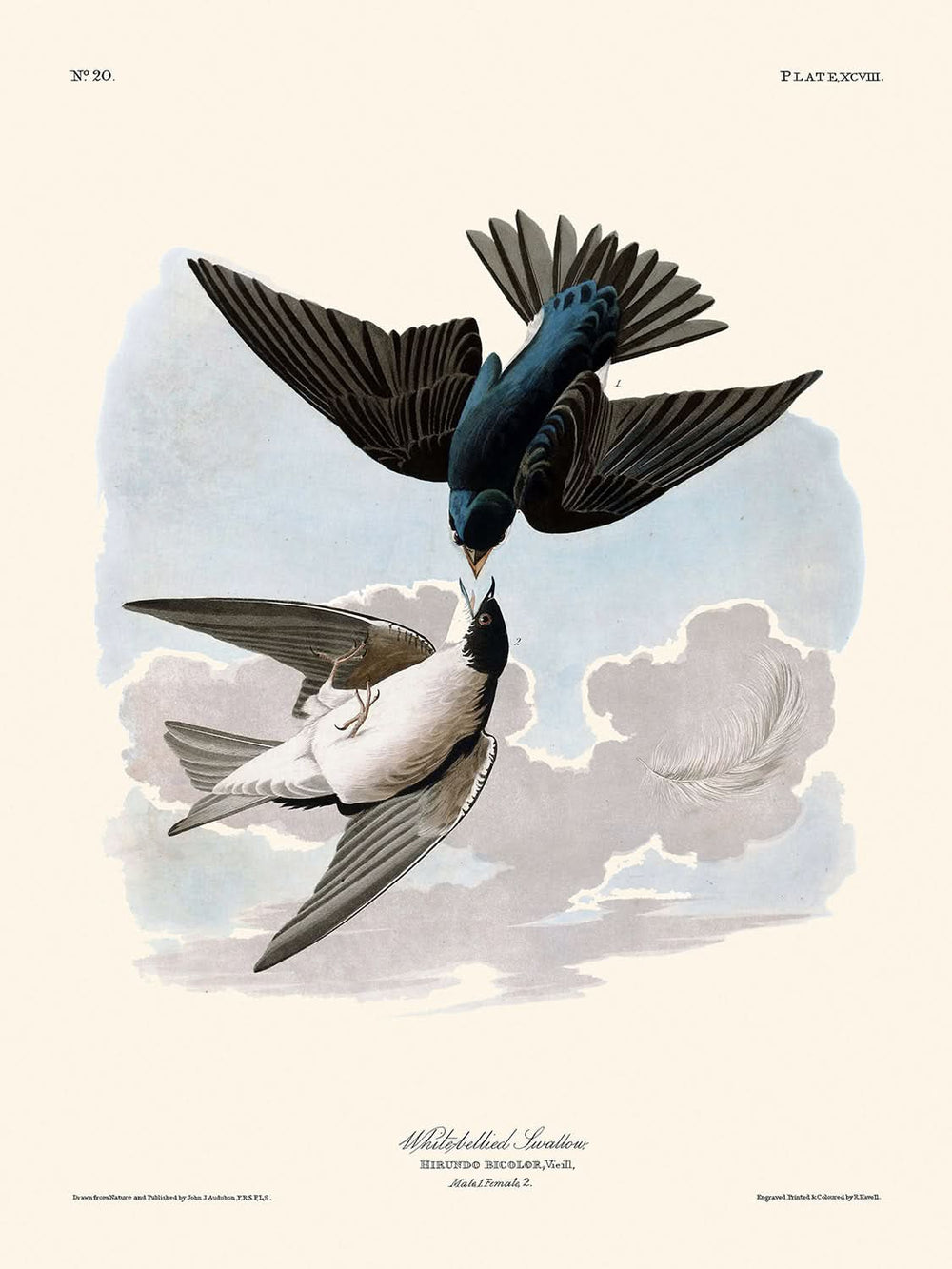 Ciò che rende quest'opera d'arte veramente straordinaria è il suo intricato dettaglio e l'uso vibrante del colore per ritrarre la rondine. Le parti superiori dell'uccello sono splendidamente rappresentate con tonalità blu acciaio e riflessi verdi, contrastati dalle sue parti inferiori bianche. Questa rappresentazione abile non solo incanta lo spettatore, ma esemplifica anche l'incomparabile capacità di Audubon di mescolare precisione scientifica con eleganza artistica.