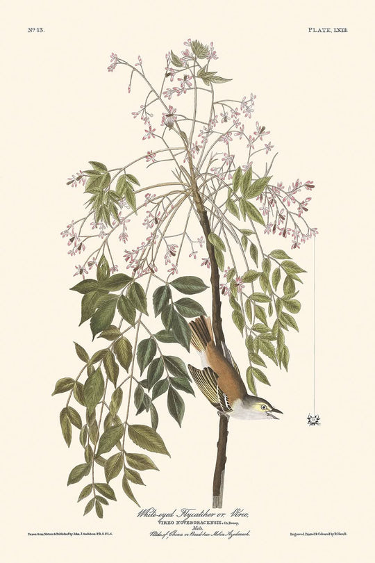 Il Cacciatore dagli Occhi Bianchi o Vireo, noto scientificamente come Vireo noveboracensis, è notevole per la sua presenza allegra e dinamica in tutto il territorio degli Stati Uniti. La rappresentazione di Audubon mostra l'uccello con grande meticolosità, posato su un ramo dell'albero Orgoglio della Cina, una pianta ornamentale con fiori profumati. In quest'opera, le sfumature di verde oliva chiaro e giallo brillante spiccano contro i verdi naturali del suo habitat, rendendo quest'opera d'arte ideale per gli appassionati di uccelli e amanti dell'arte.