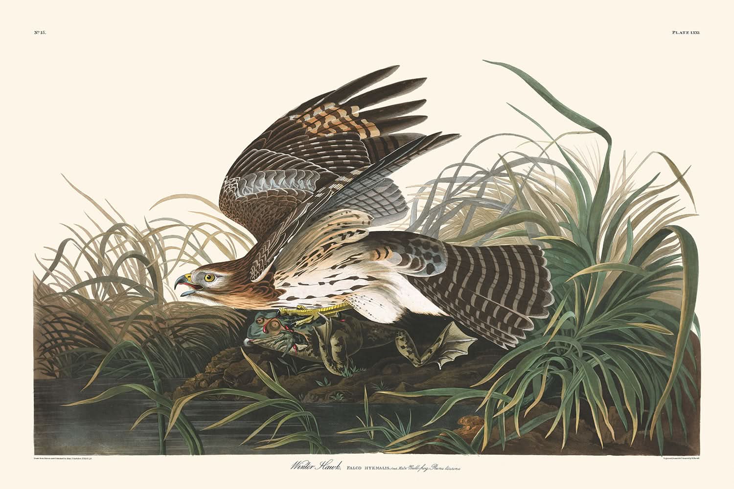 L'illustrazione del Falco Invernale è notevole non solo per la sua rappresentazione realistica ma anche per l'impegno di Audubon verso l'accuratezza e l'arte. Il suo utilizzo di toni naturali e posture dinamiche dà vita al falco, rendendolo un'aggiunta straordinaria a qualsiasi collezione.