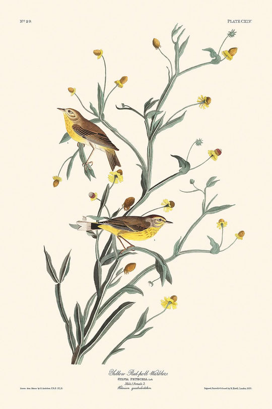 La "Yellow Red-poll Warbler" di John James Audubon è un'illustrazione affascinante della sua rinomata collezione, Birds of America, creata nel 1827. Audubon, un noto ornithologo e pittore, dedicò la sua vita a documentare le specie aviarie del Nord America con straordinaria precisione e talento artistico. Il suo lavoro innovativo non solo mostrava la bellezza degli uccelli, ma contribuiva anche in modo significativo agli studi ornitologici, rendendolo una figura di spicco sia nell'arte che nella scienza.